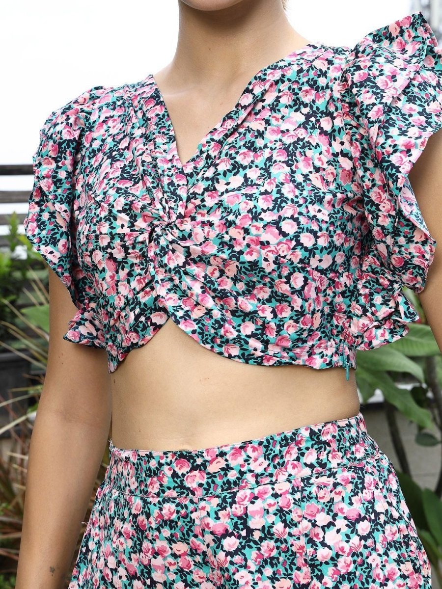 Printed Shoulder Strap Neck Top With Skirt Co-Ord Set sea-green