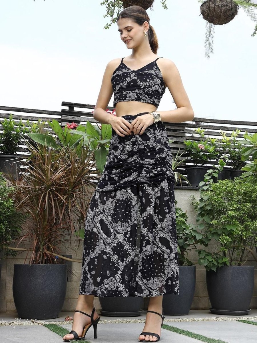Printed Shoulder Strap Neck Top With Skirt Co-Ord Set black