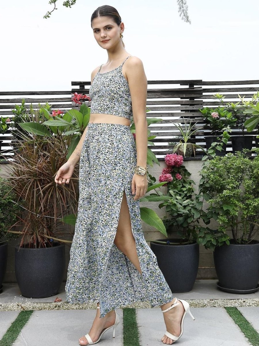 Printed Shoulder Strap Neck Top With Skirt Co-Ord Set multi