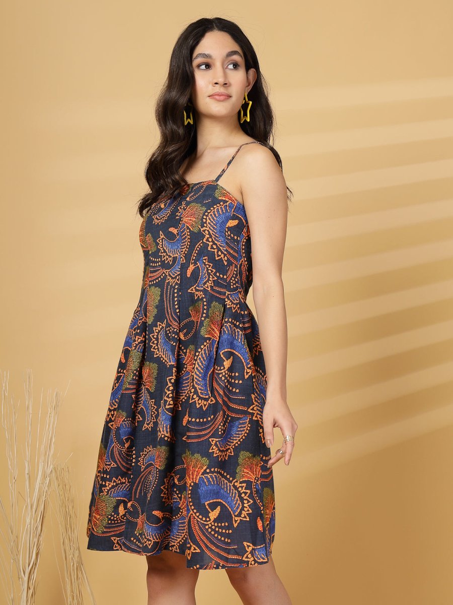 Floral Printed Shoulder Straps Fit and Flare Dress