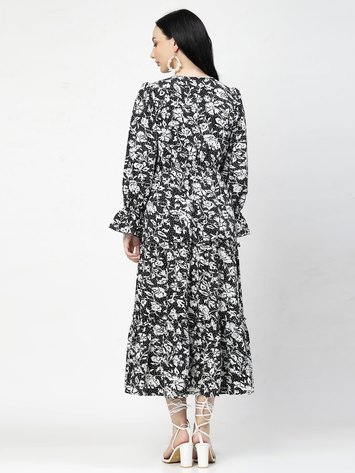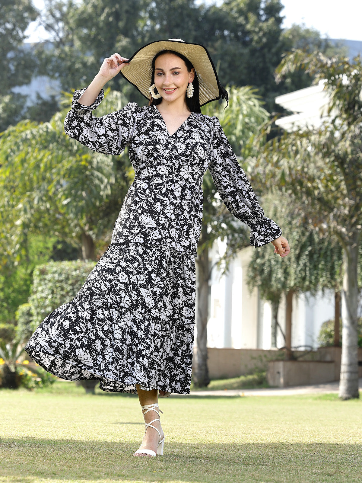 Black Paisley Printed Puff Sleeves Gathered A-Line Dress
