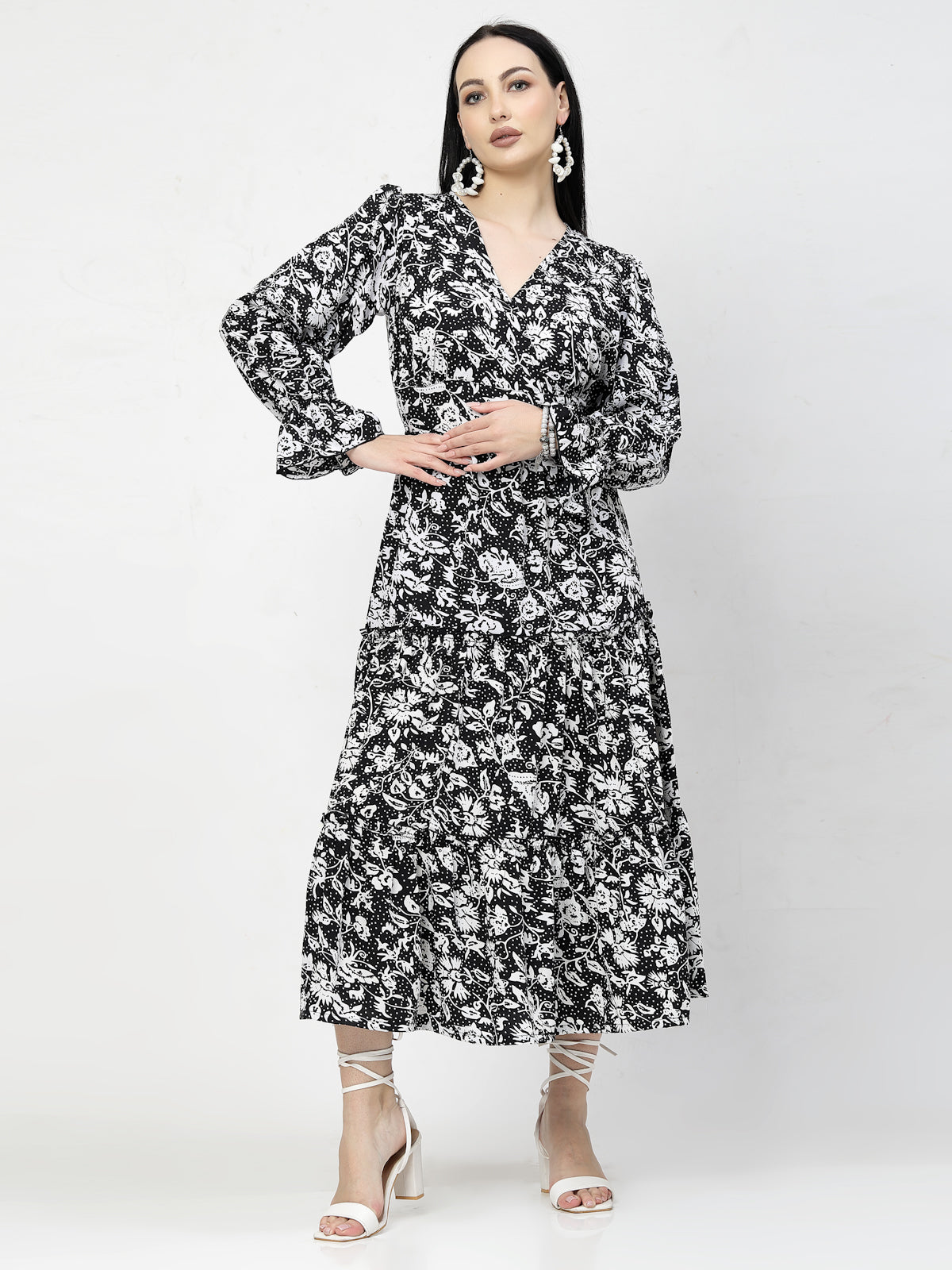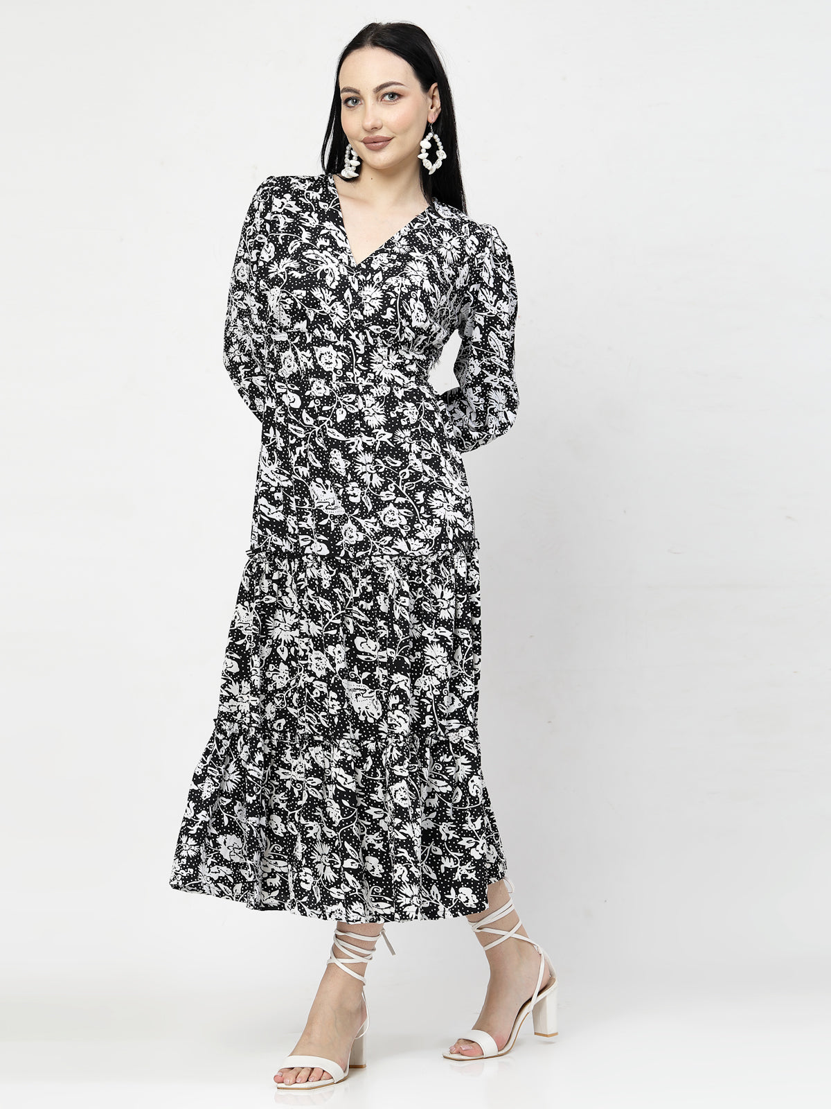 Black Blue Floral Printed V-Neck Puff Sleeves Gathered A-Line Dress