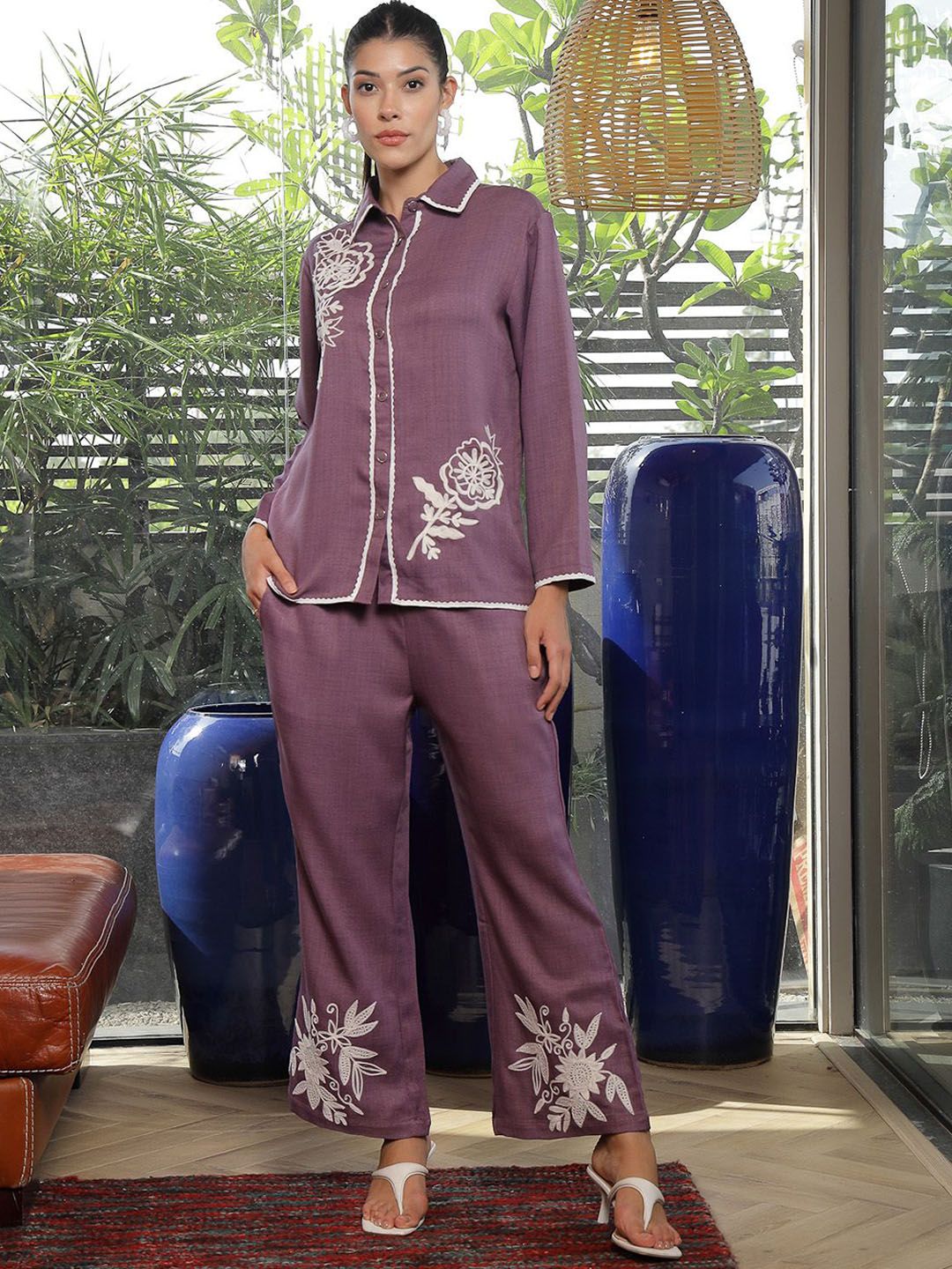 Shirt Collar Embroidered Cotton Shirt With Trousers Co-Ords Set pink