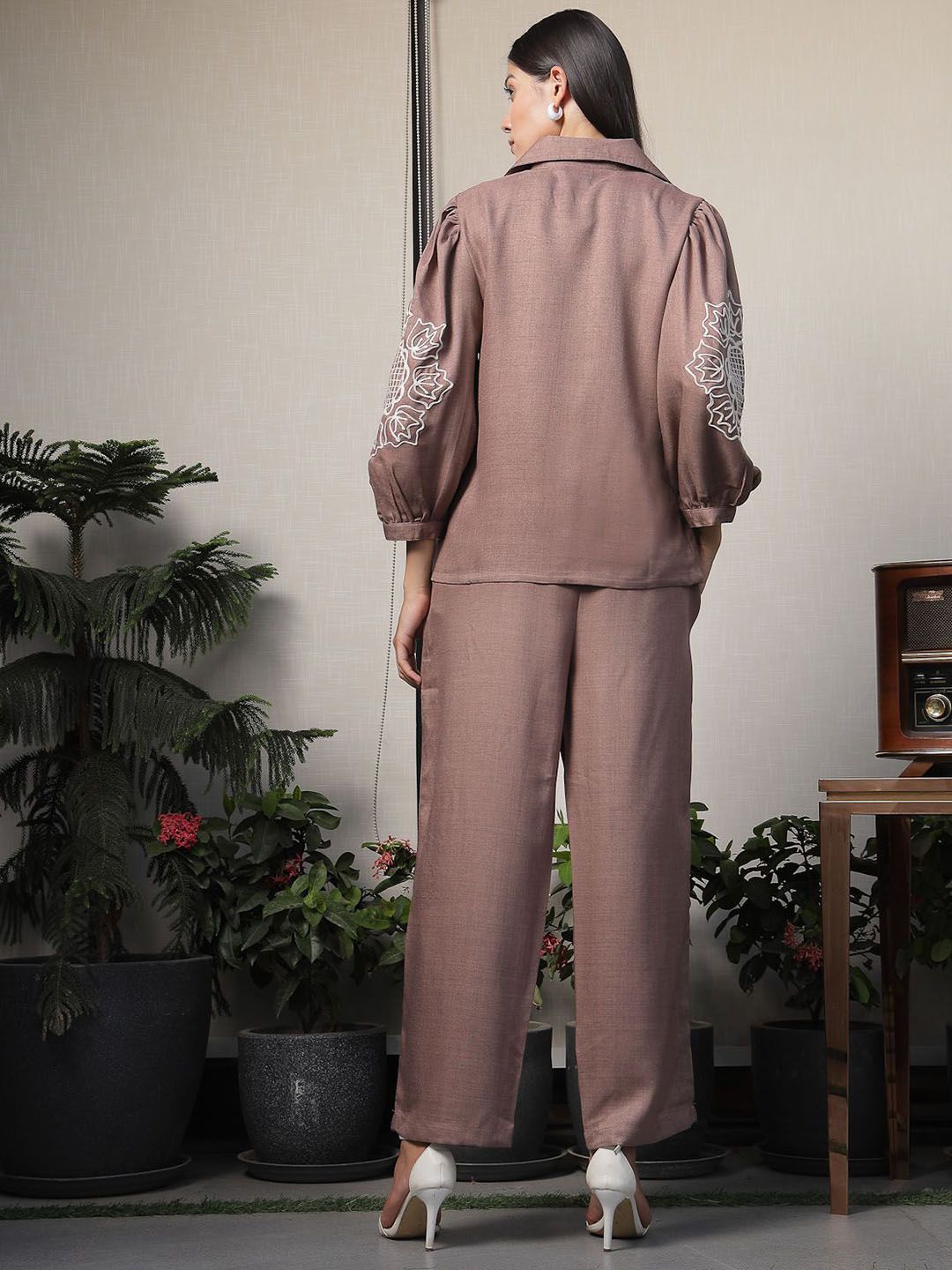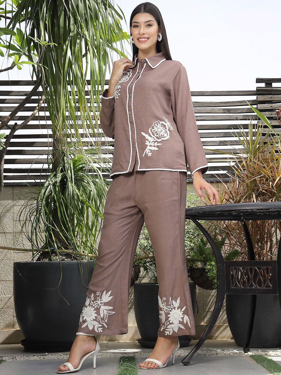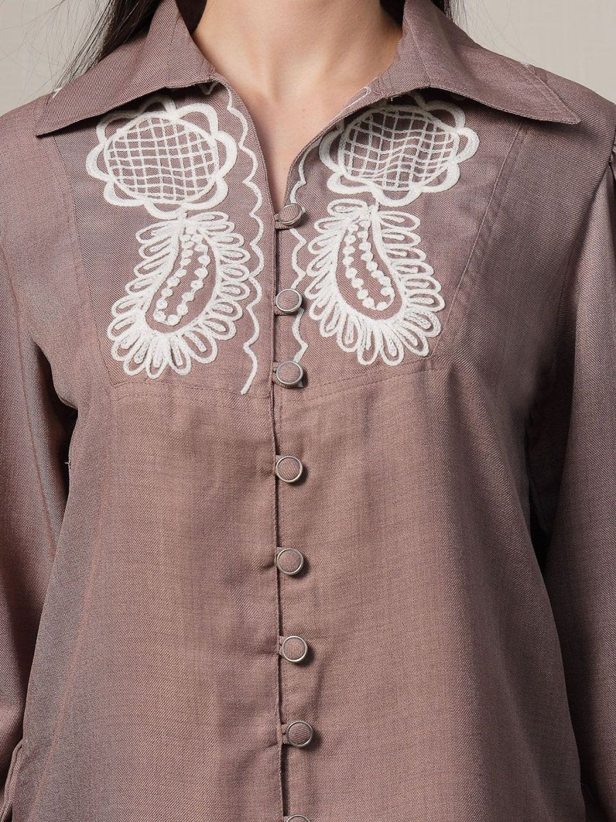 Shirt Collar Embroidered Cotton Shirt With Trousers Co-Ords Set brown