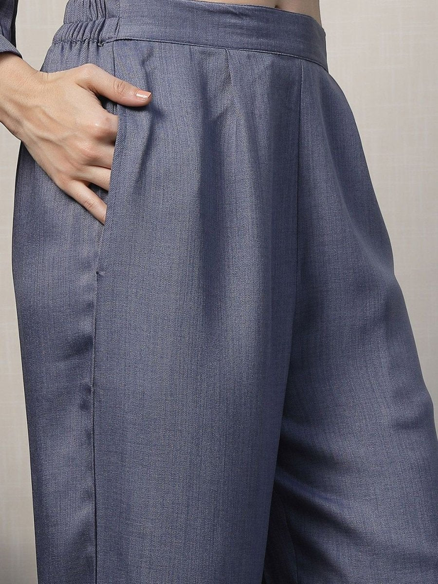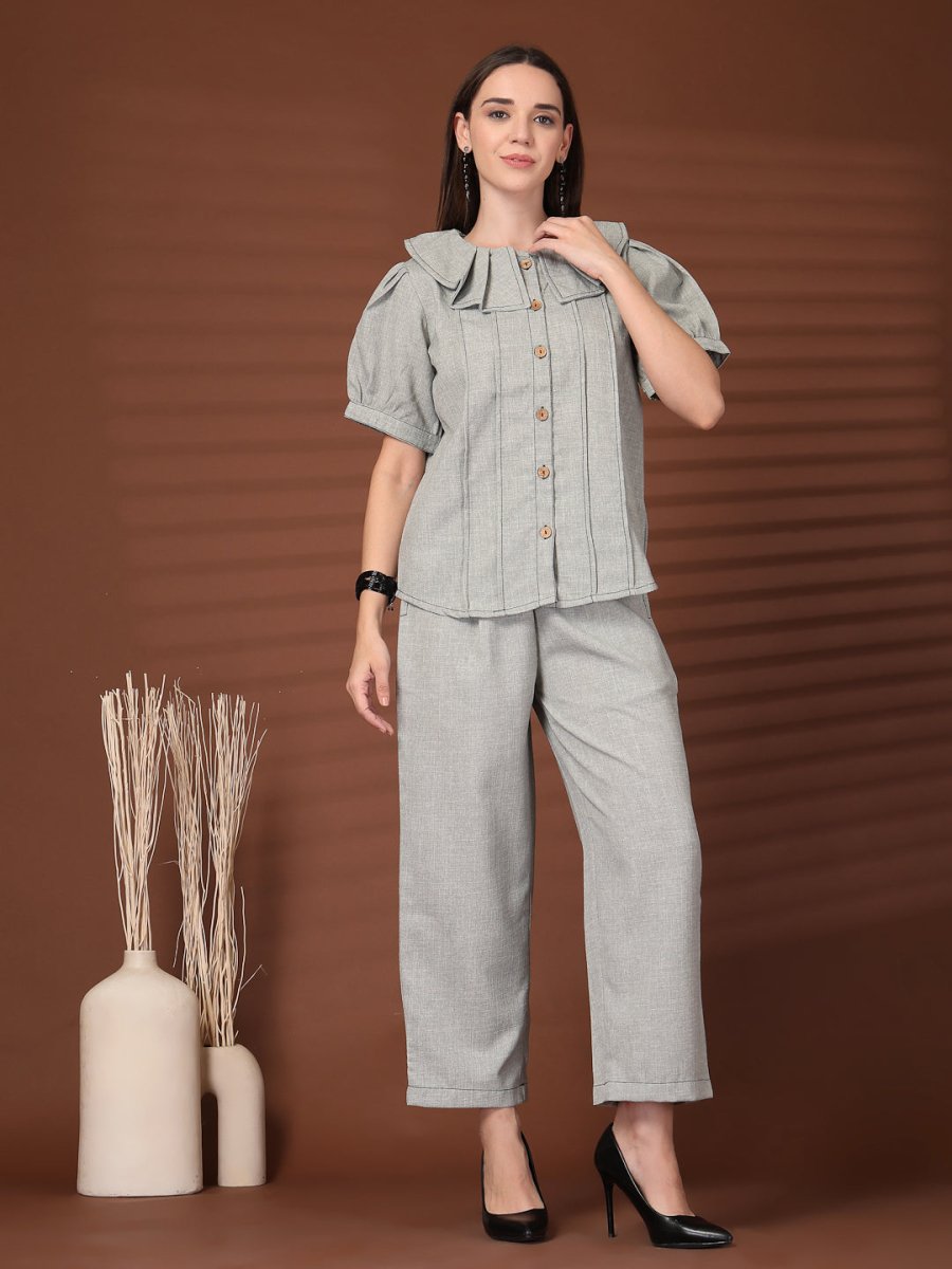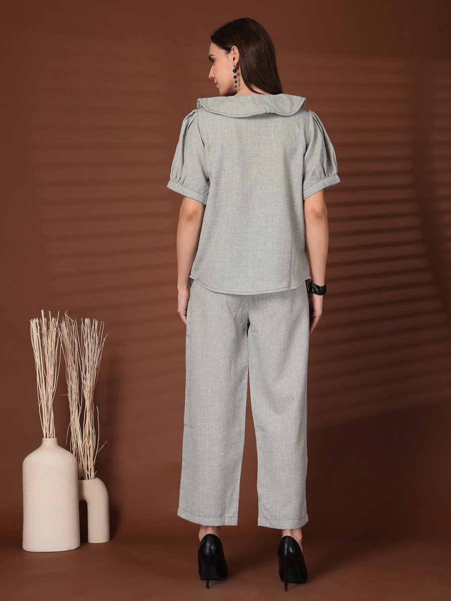 Grey Solid Round Neck Top With Trousers Co-Ords Set