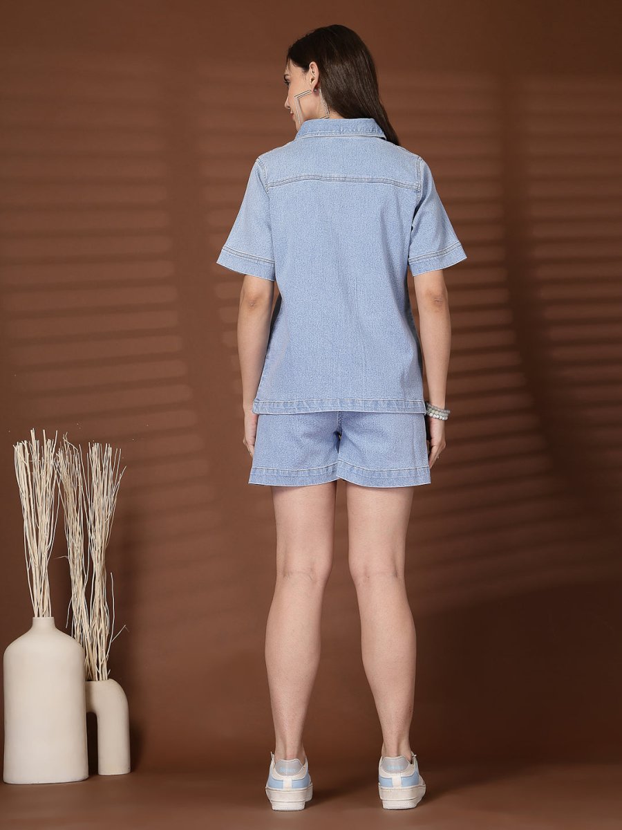 Light Blue Solid Shirt With Shorts Co-Ords Set