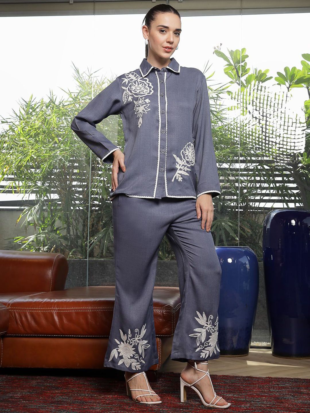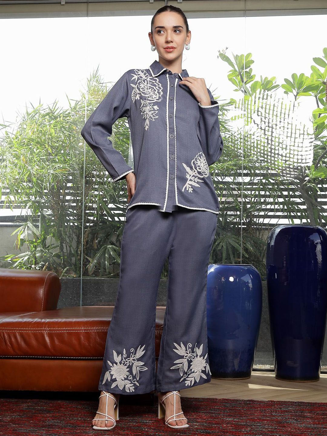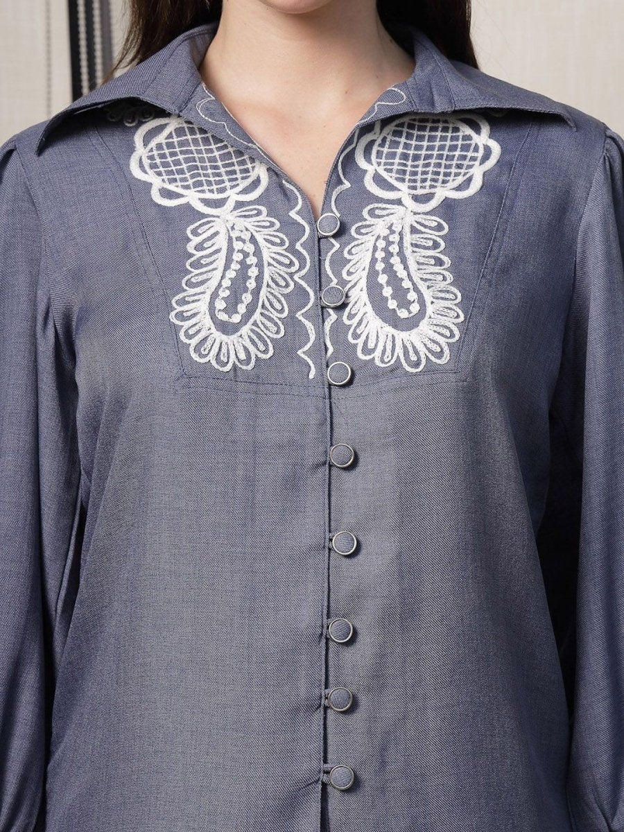 Shirt Collar Embroidered Cotton Shirt With Trousers Co-Ords Set blue