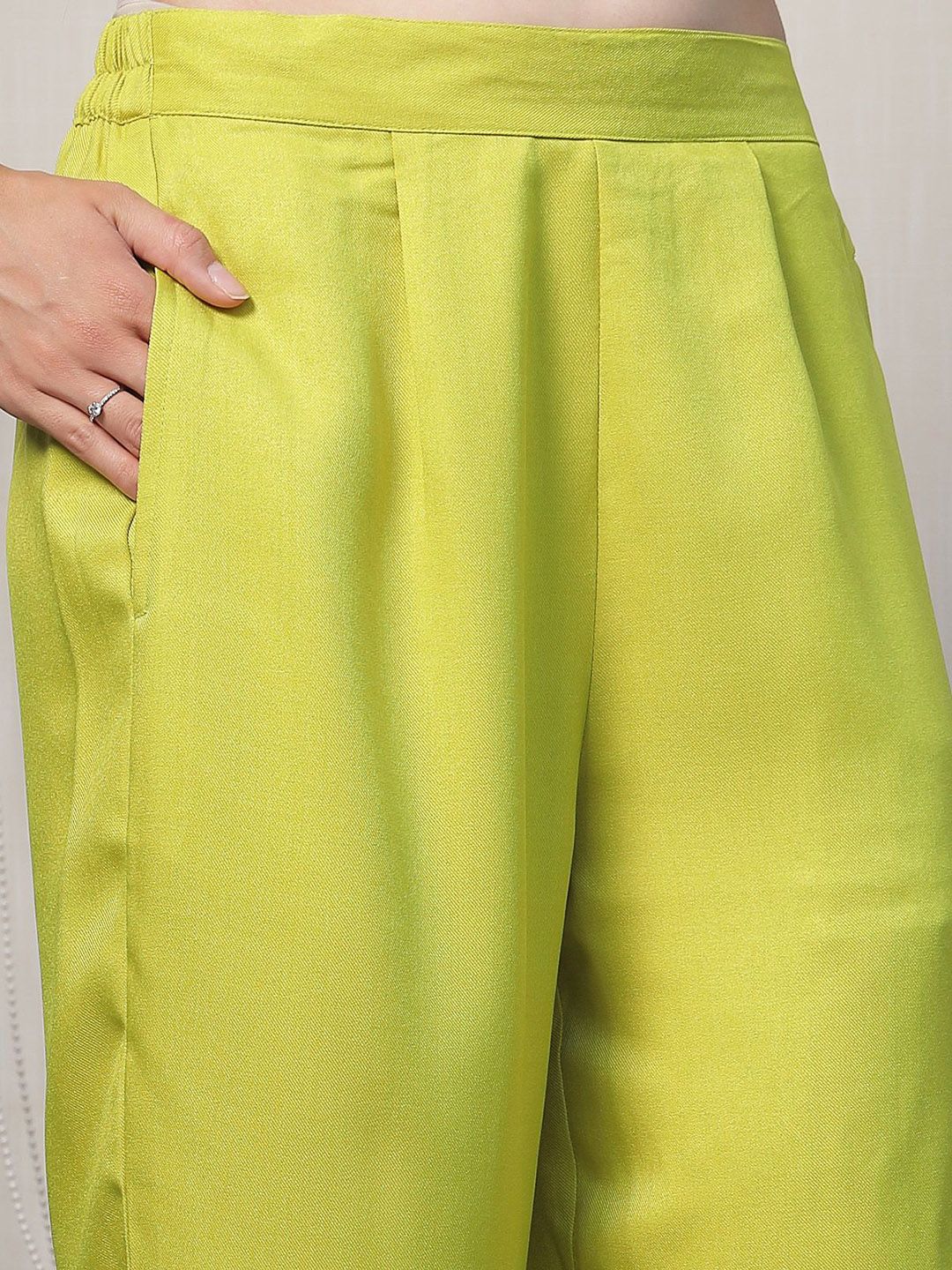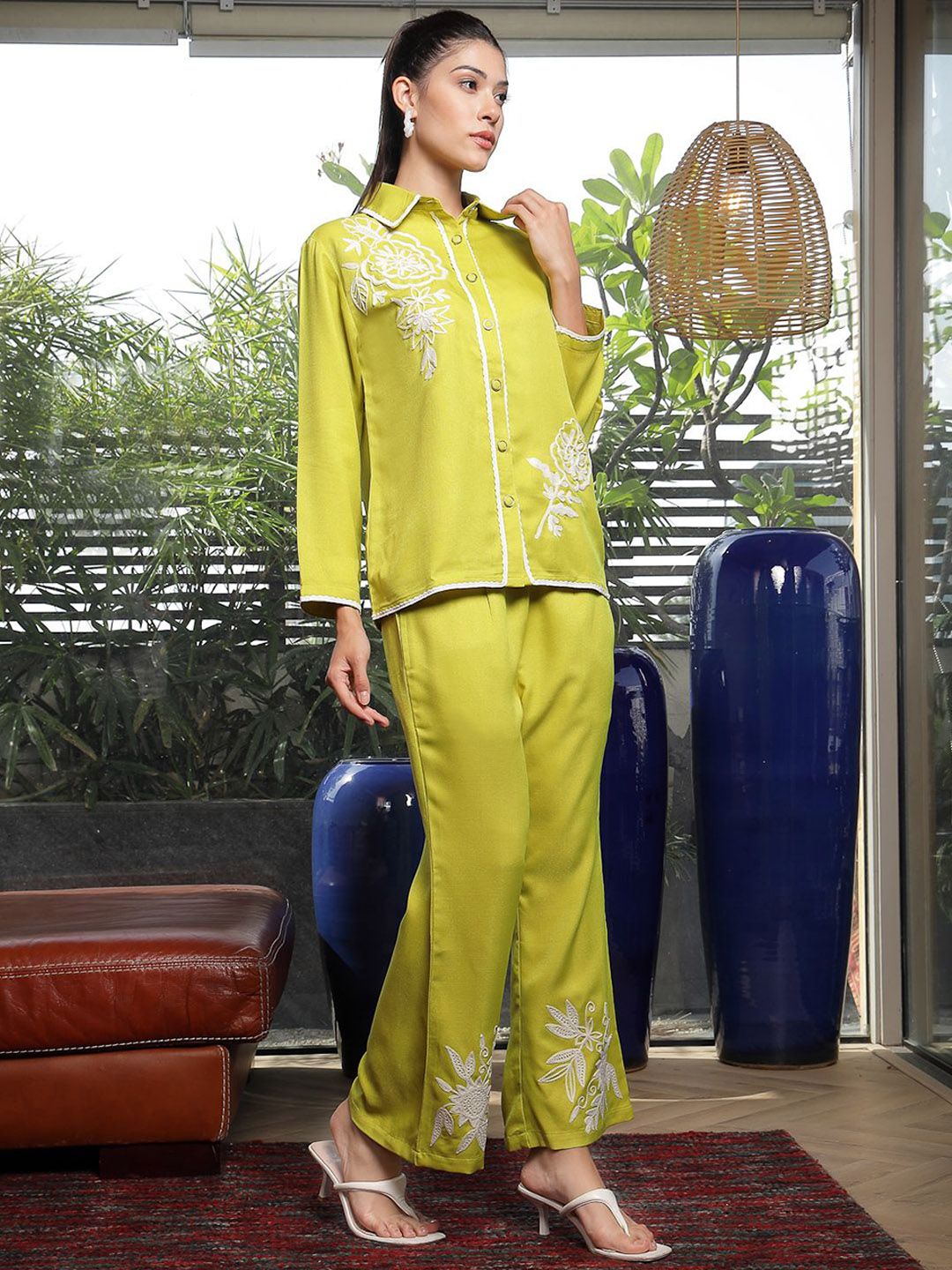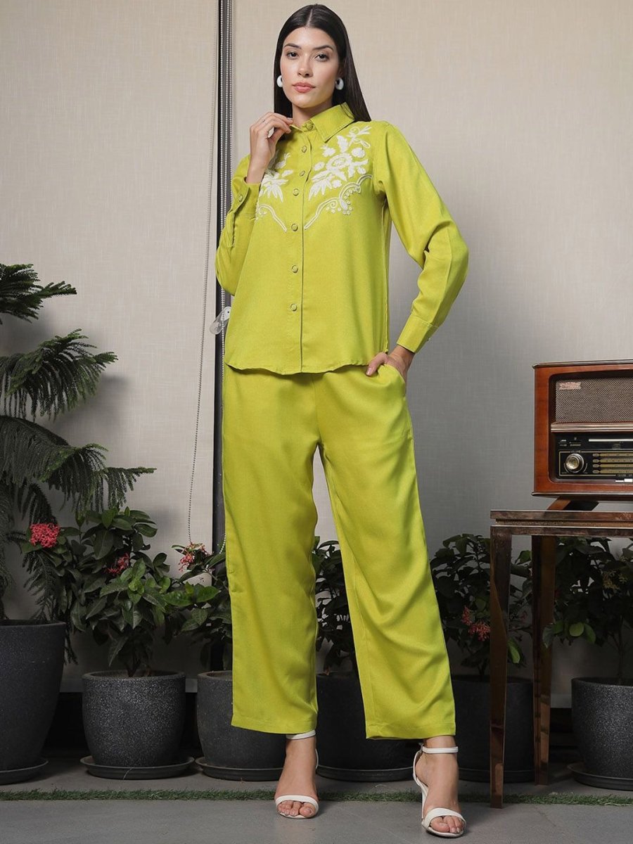 Shirt Collar Embroidered Cotton Shirt With Trousers Co-Ords Set lime-green