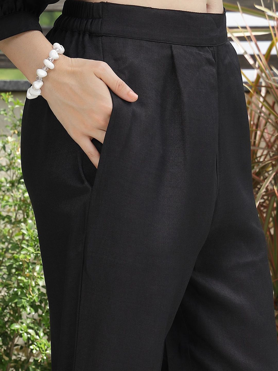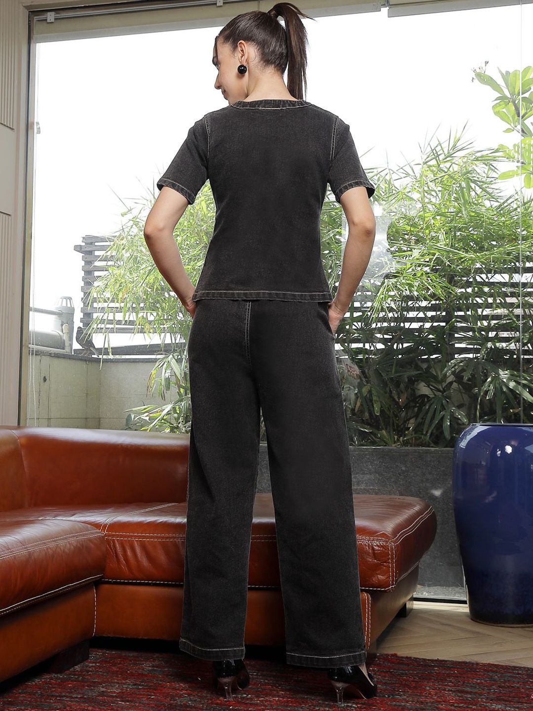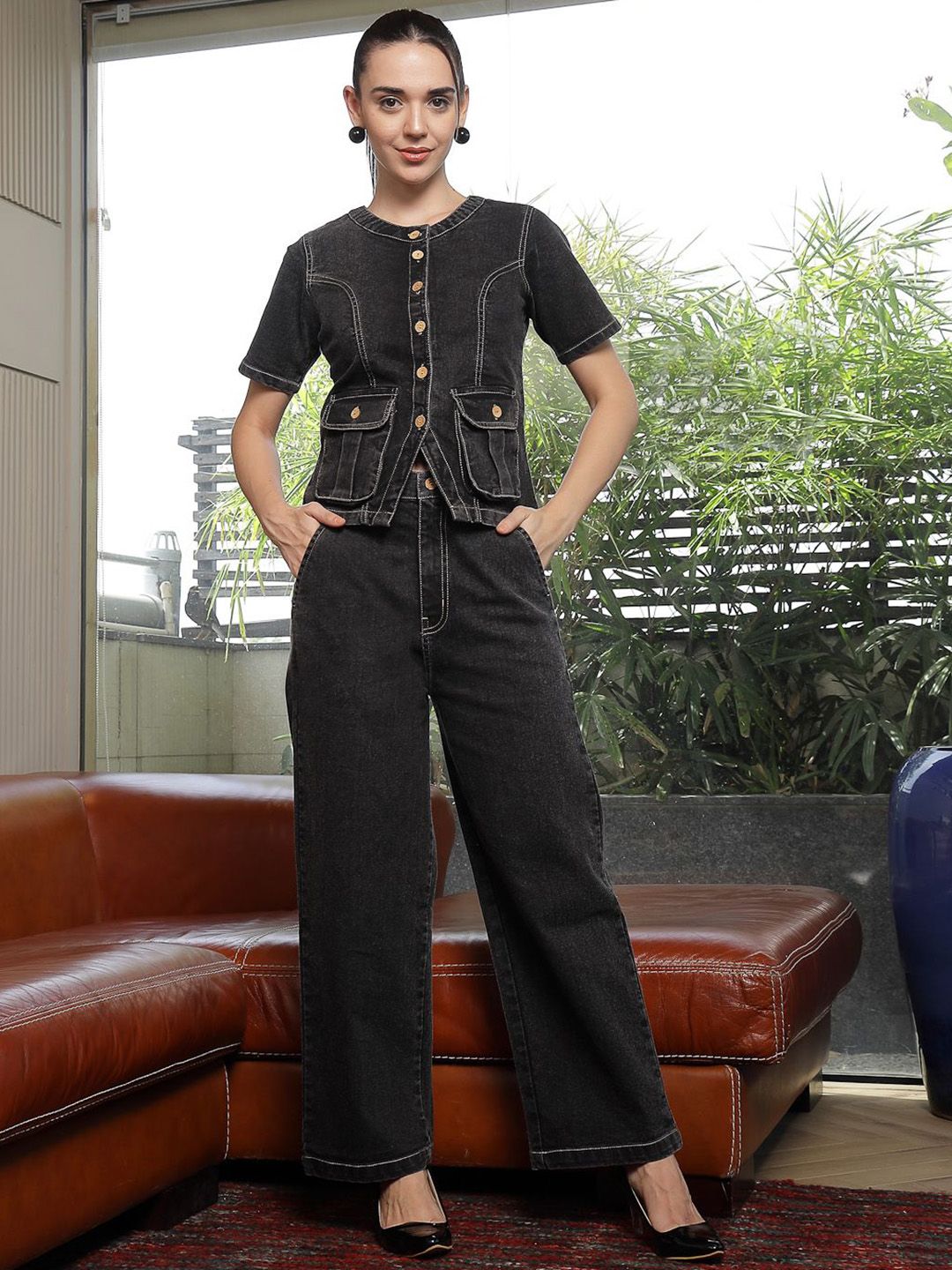 Round Neck Cotton Shirt With Trousers Co-Ords black