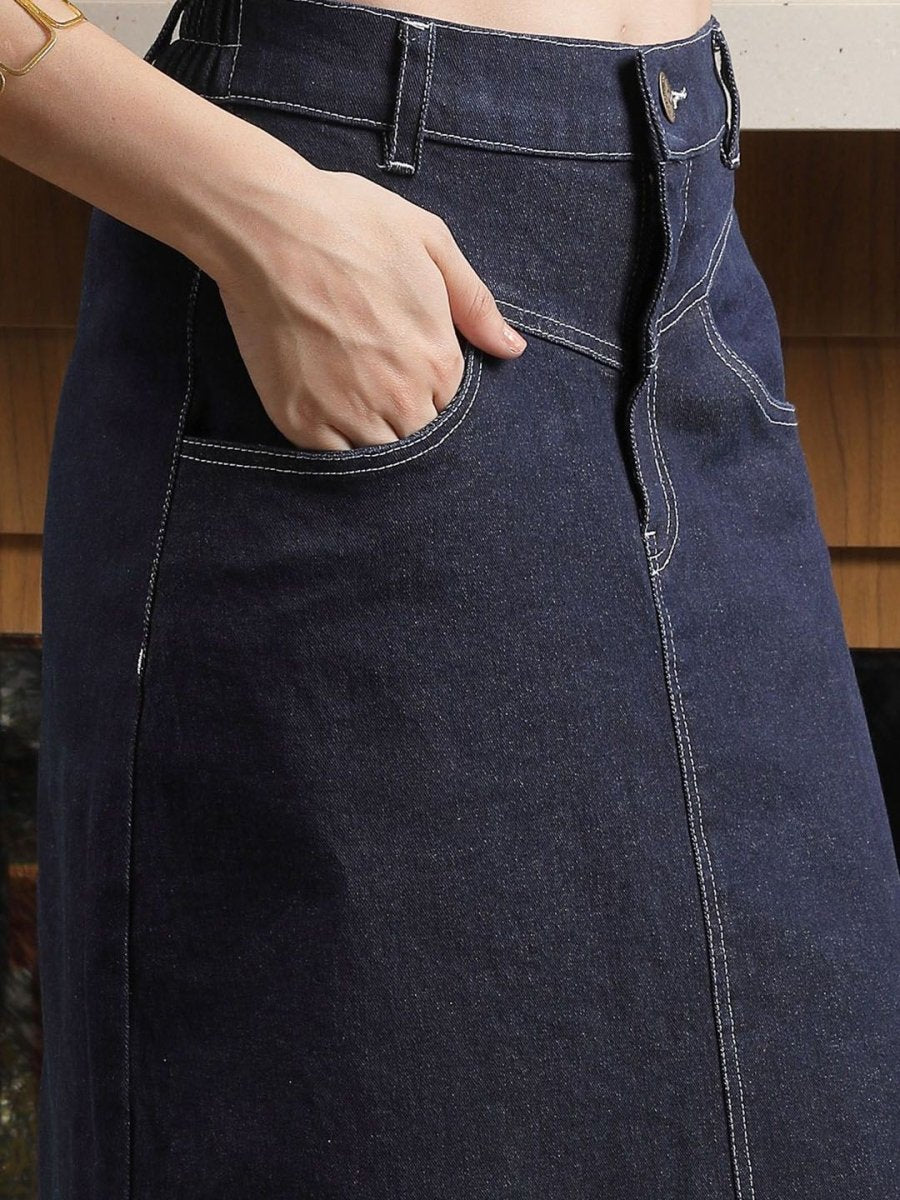 Black Solid Denim Round Neck Top With Skirt Co-Ords