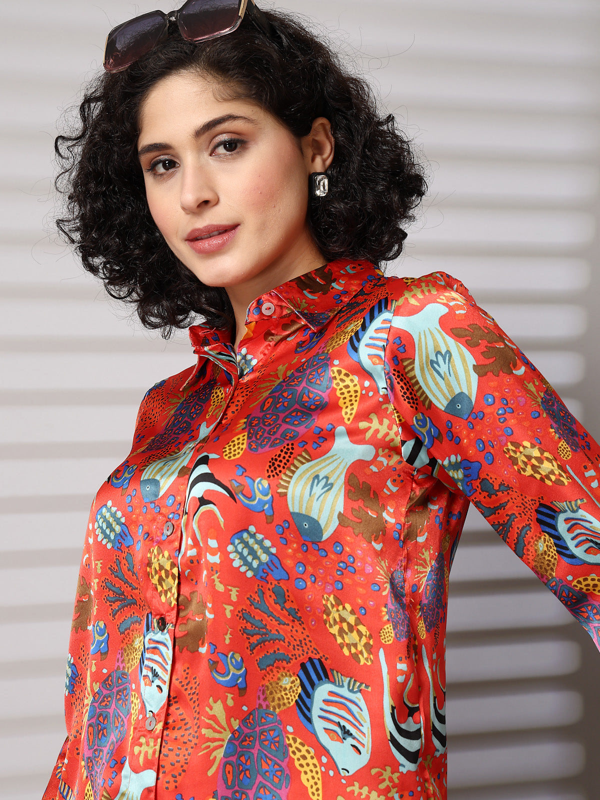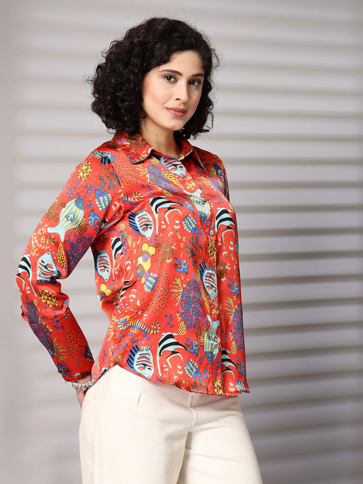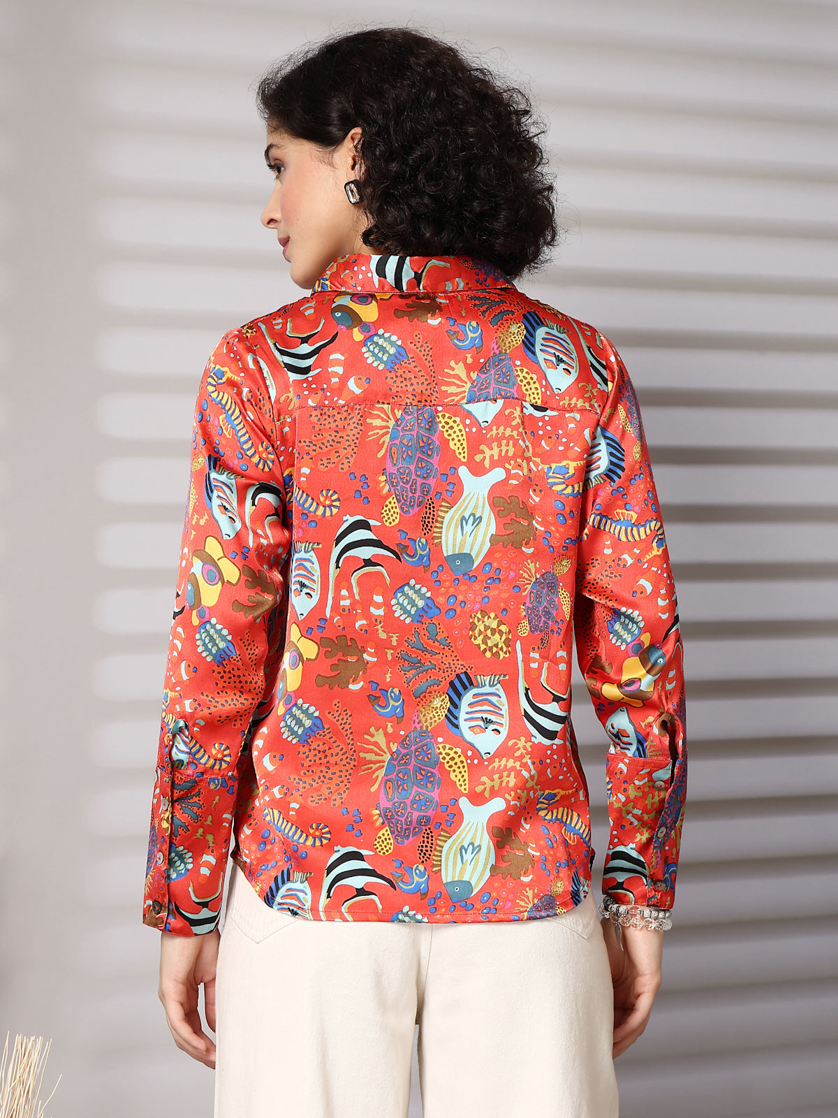 Orange Printed opaque Regular Sleeve Casual Buttoned Top