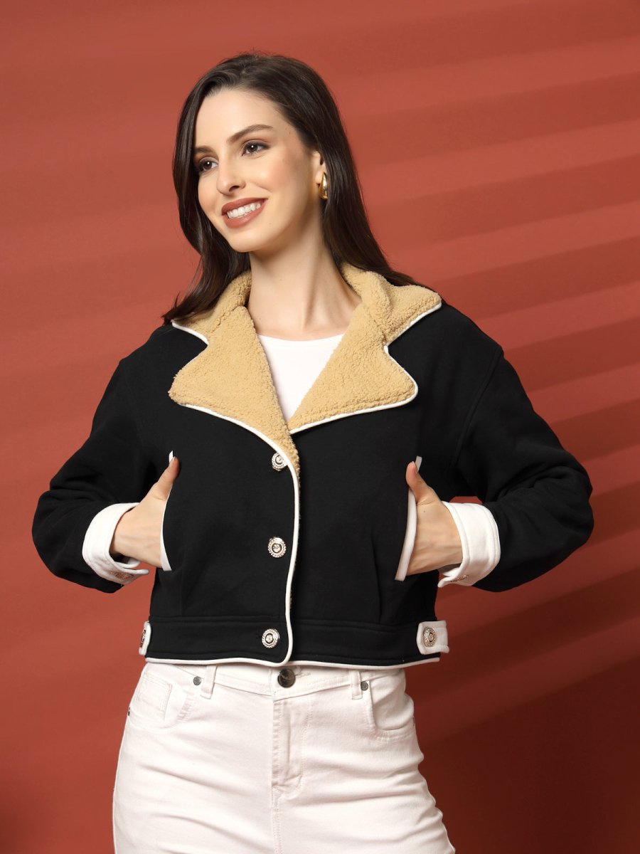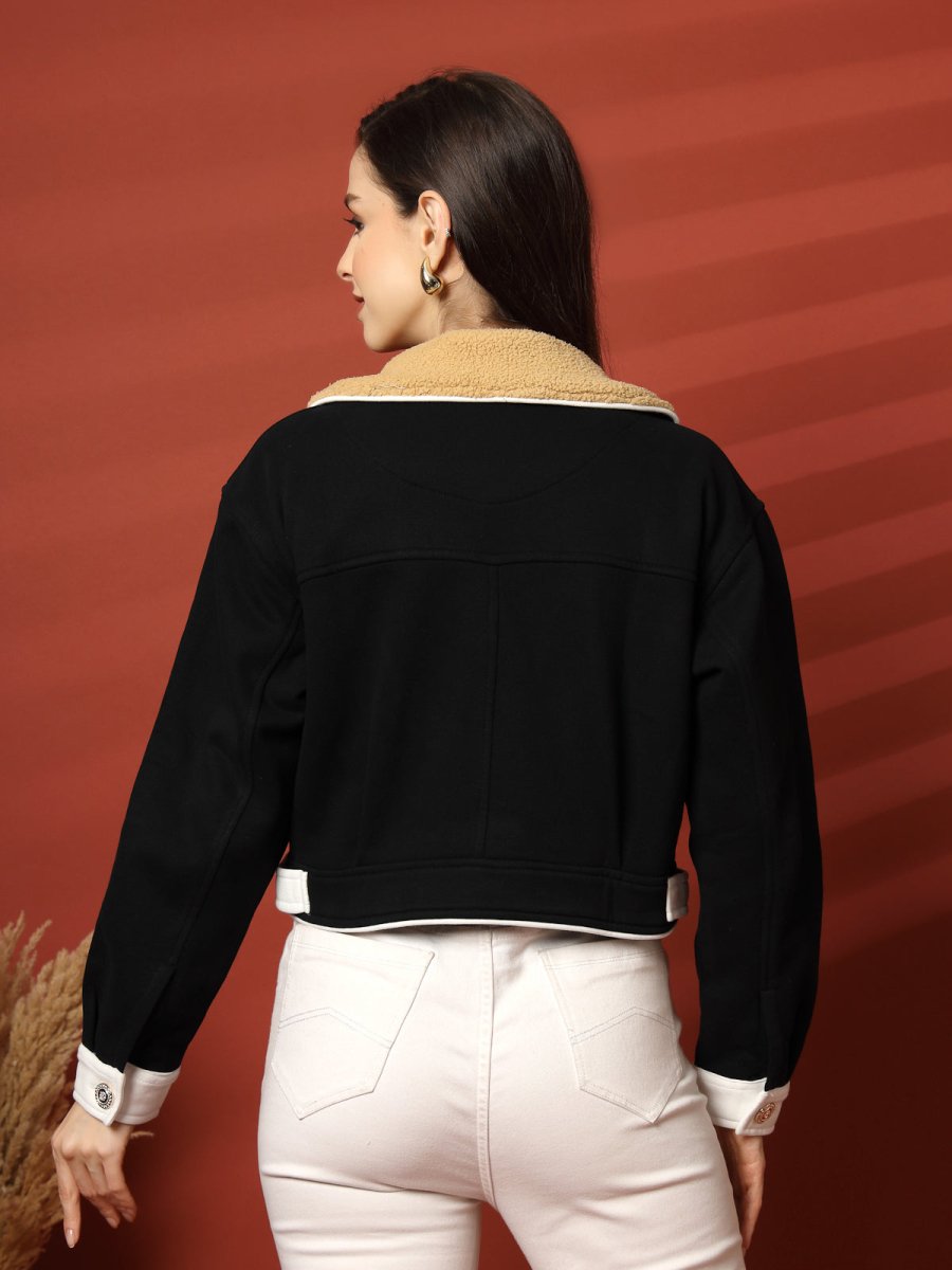 Black Self Design Spread Collar Bomber Jacket