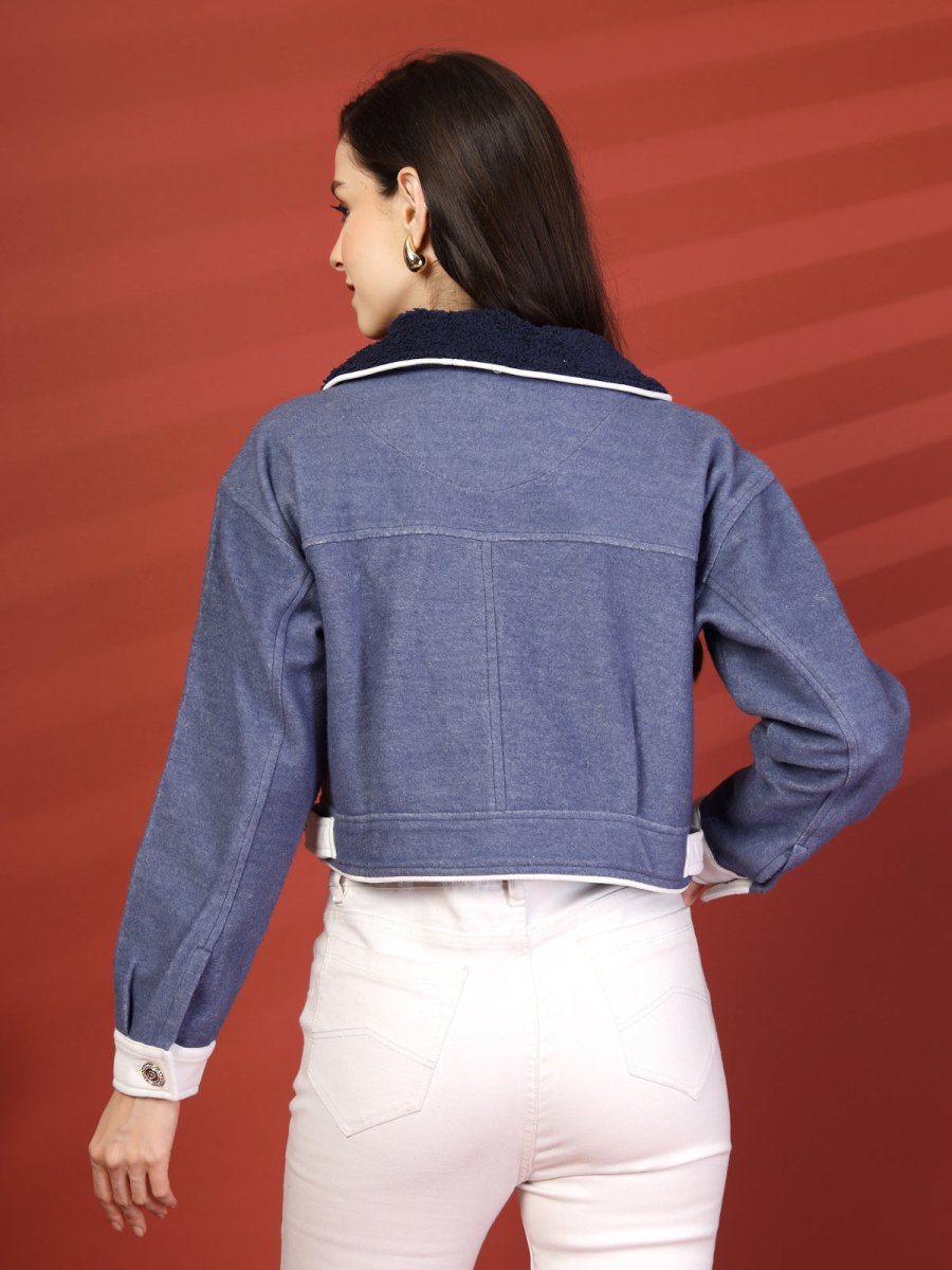 Women Front Open Solid Blue Denim Jacket