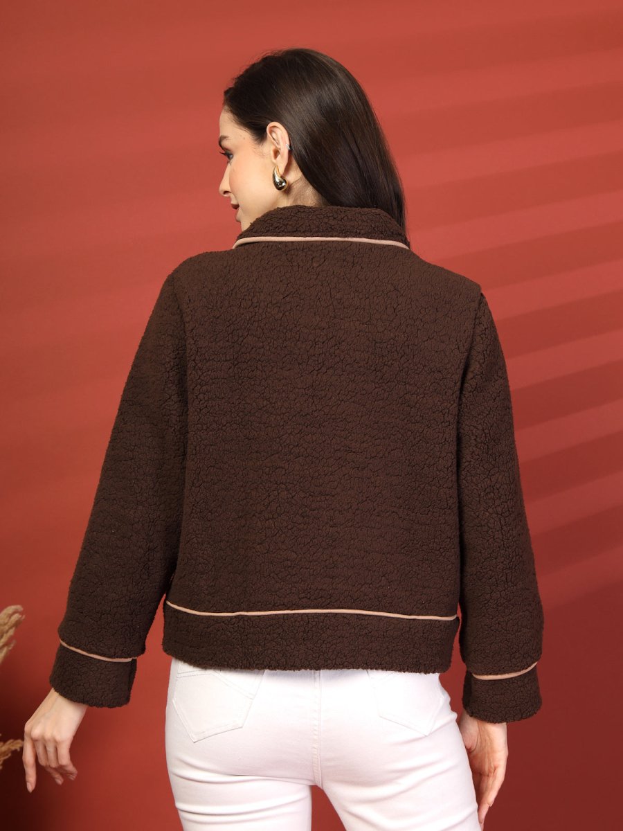Solid Brown Self Design Spread Collar Bomber Jacket