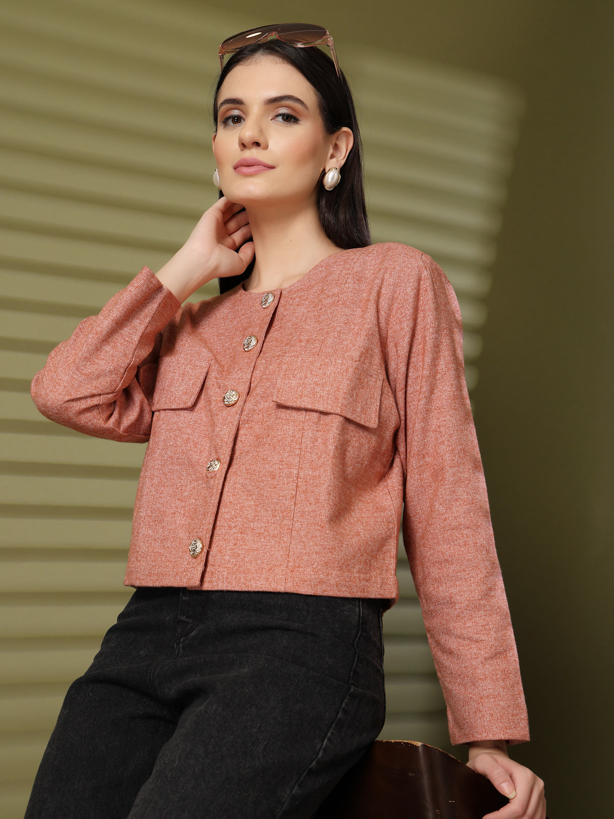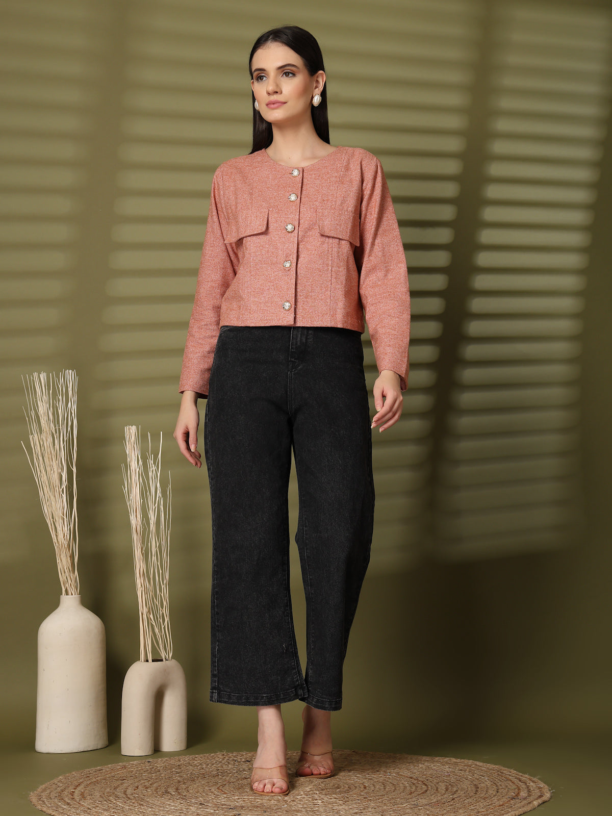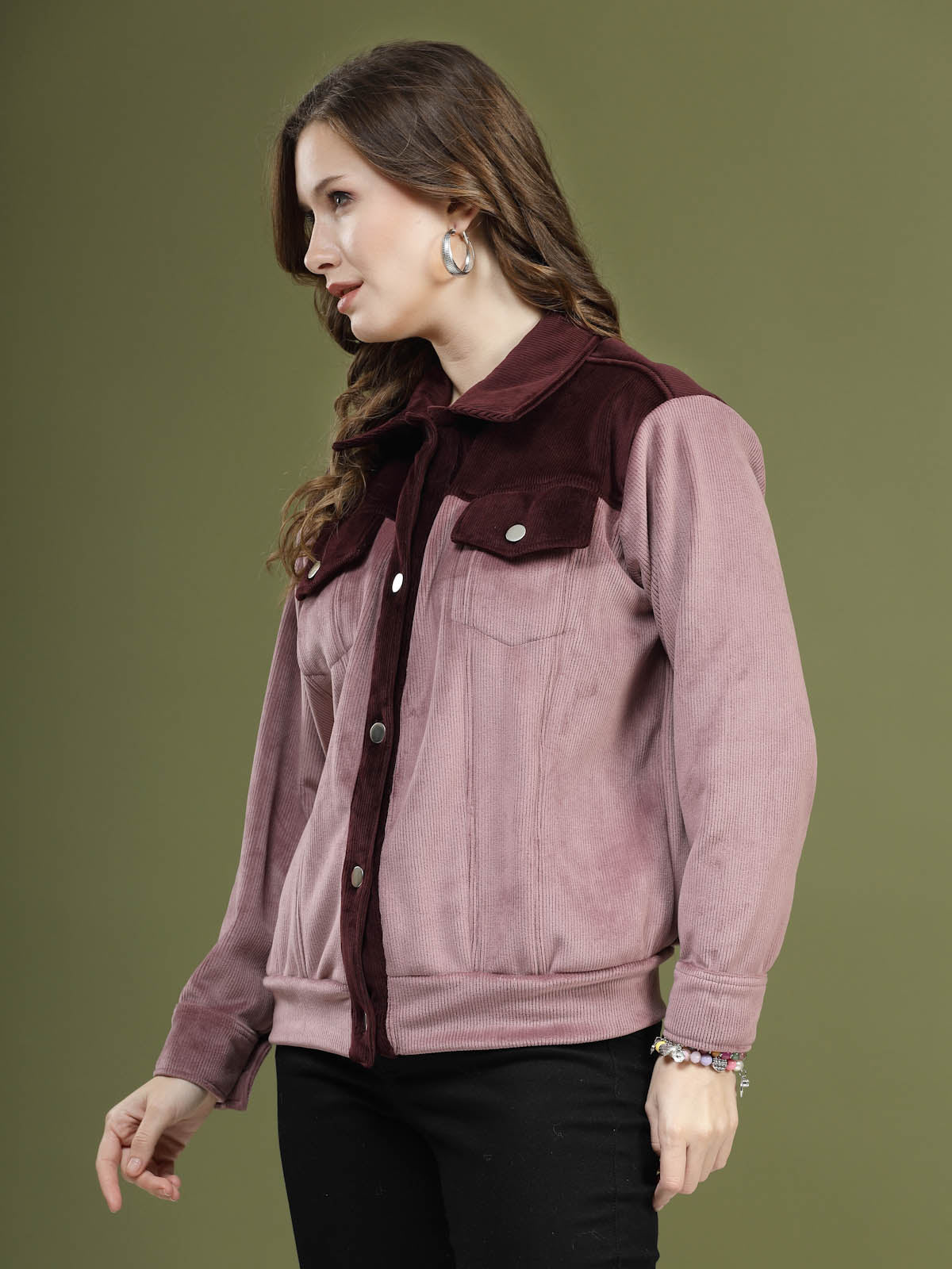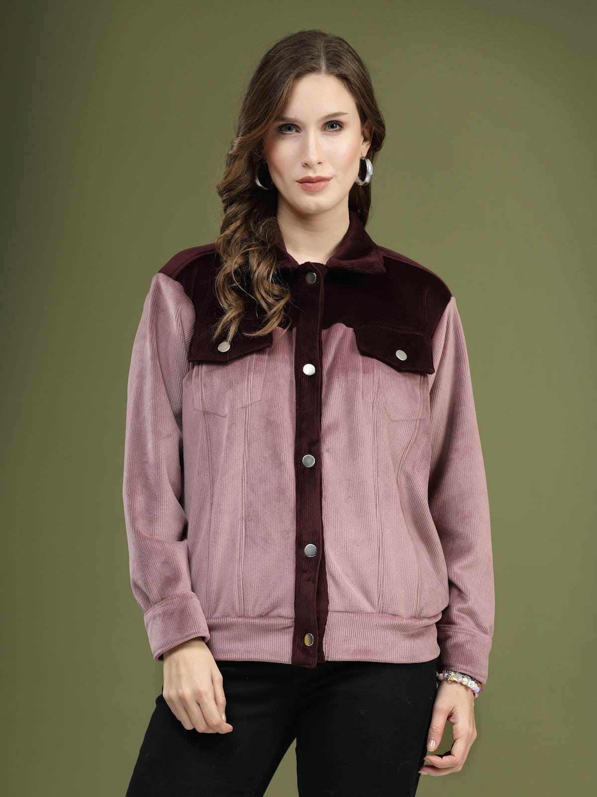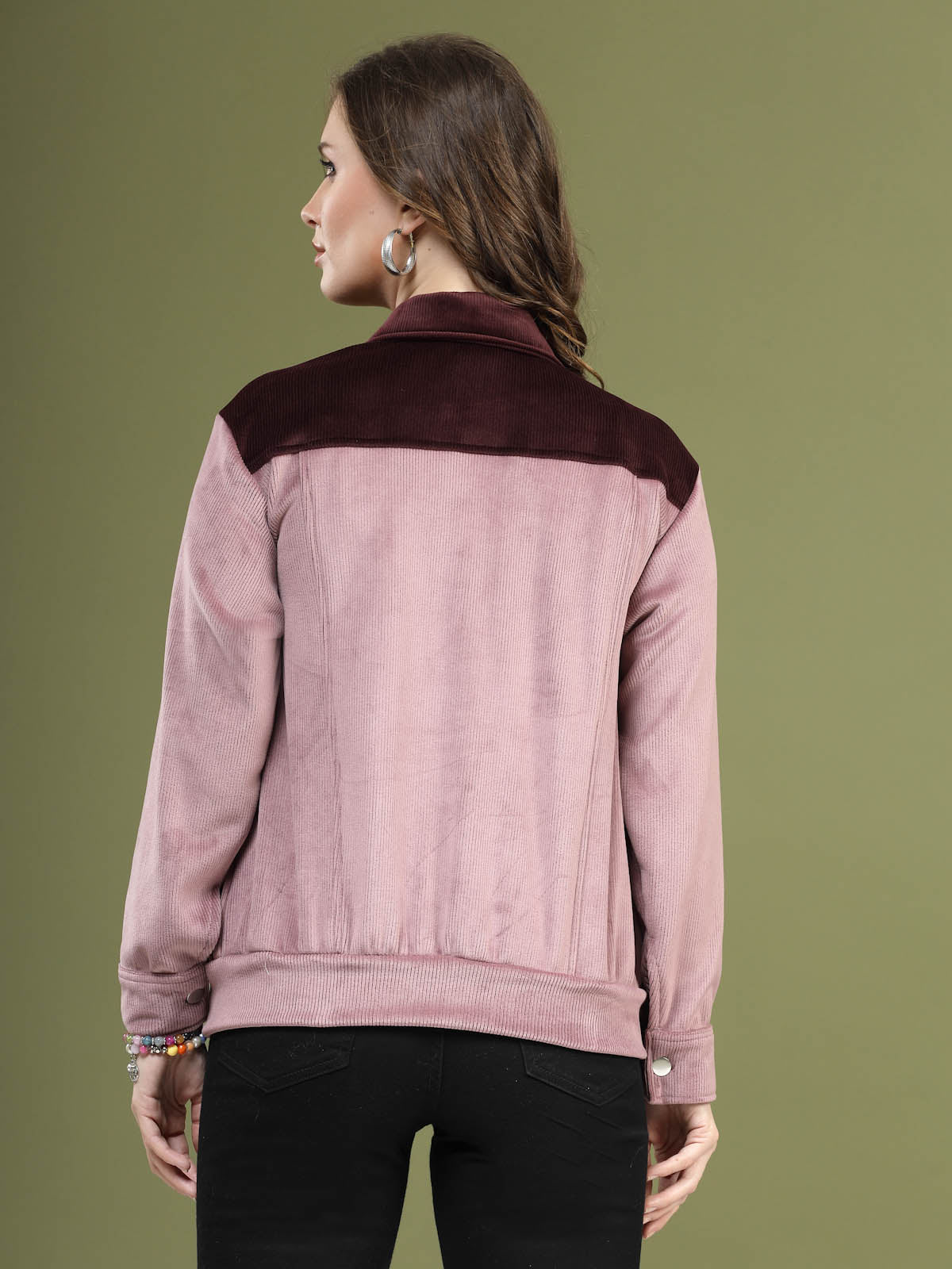 Solid Pink Self Design Spread Collar Bomber Jacket