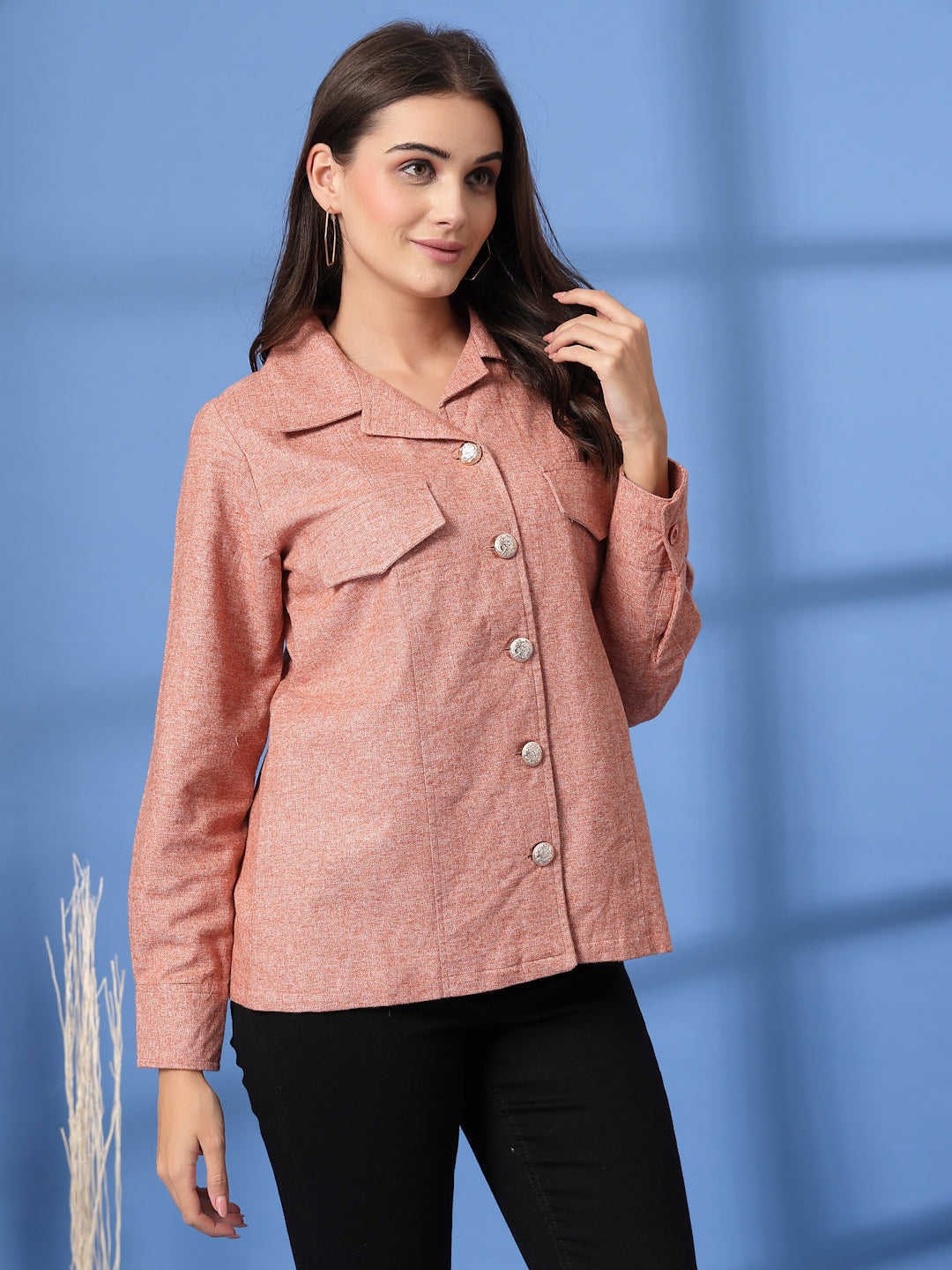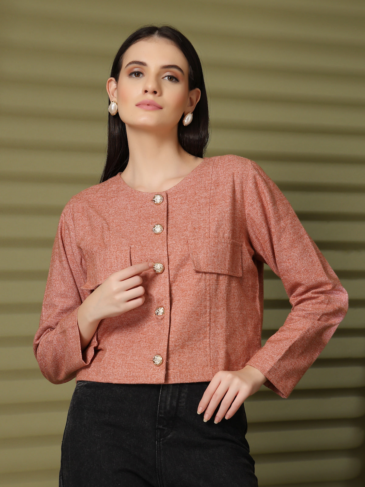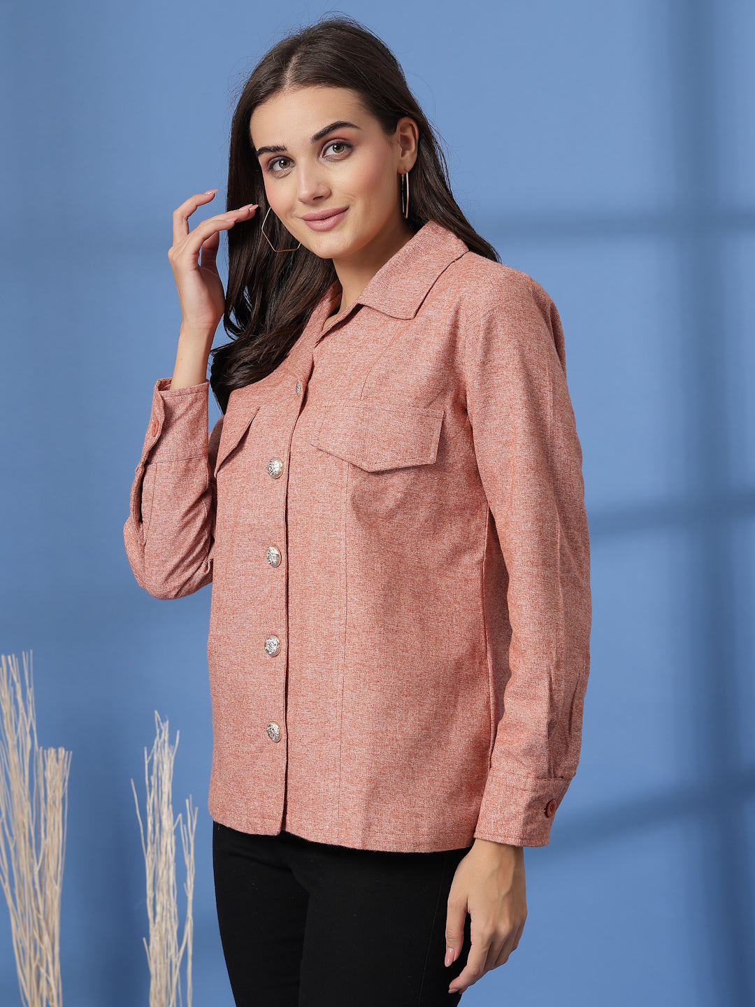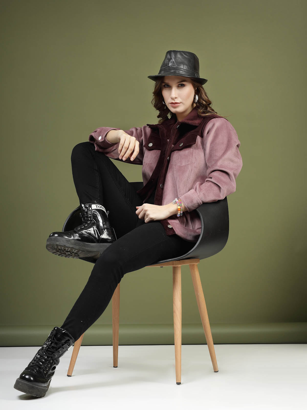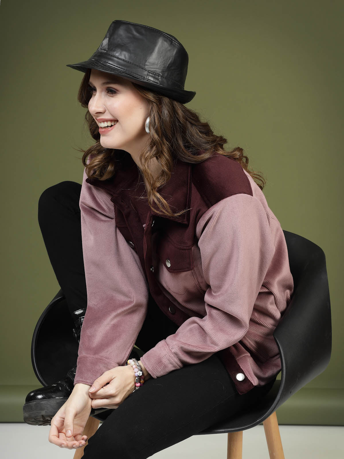 Solid Pink Self Design Spread Collar Bomber Jacket