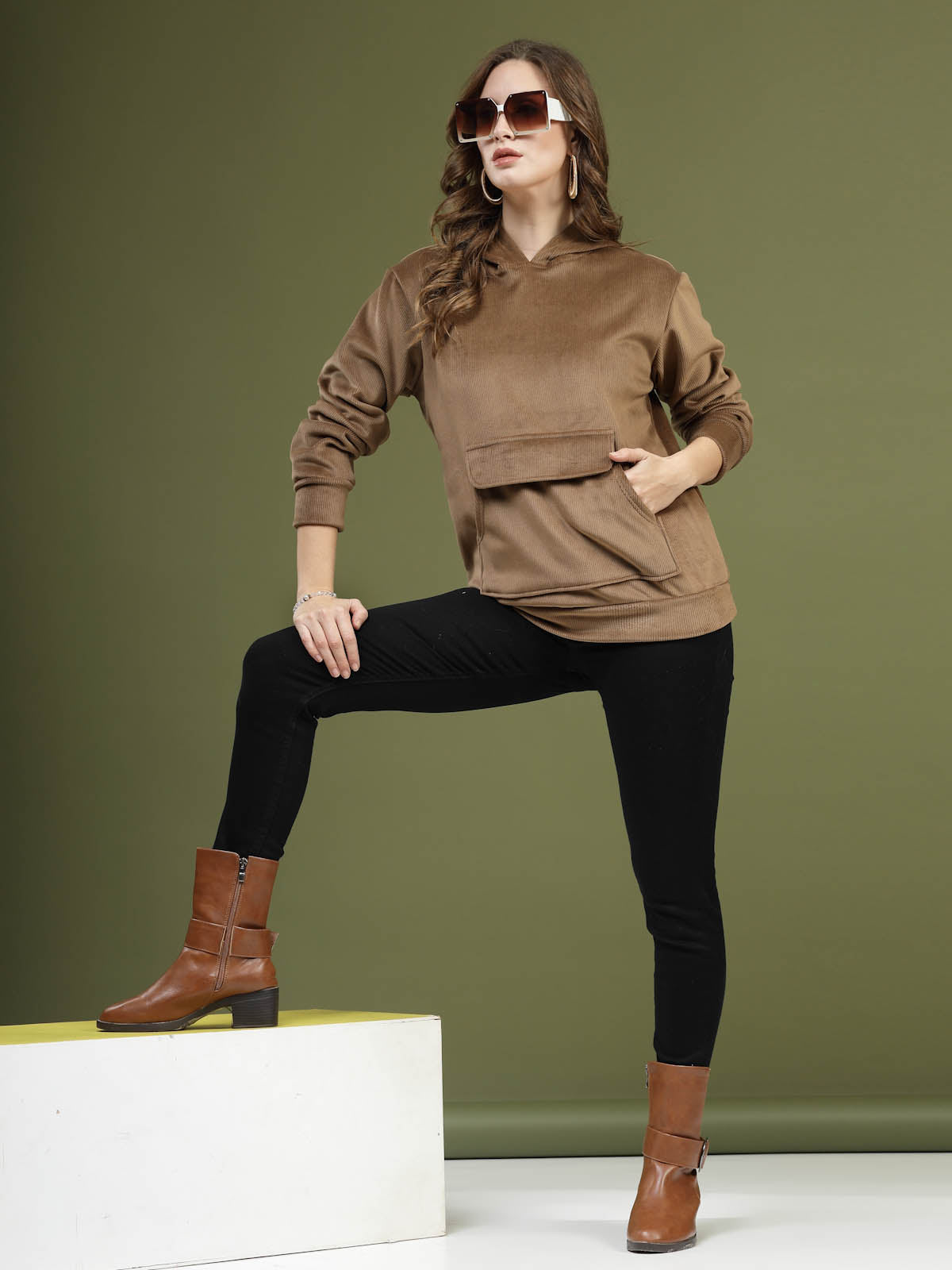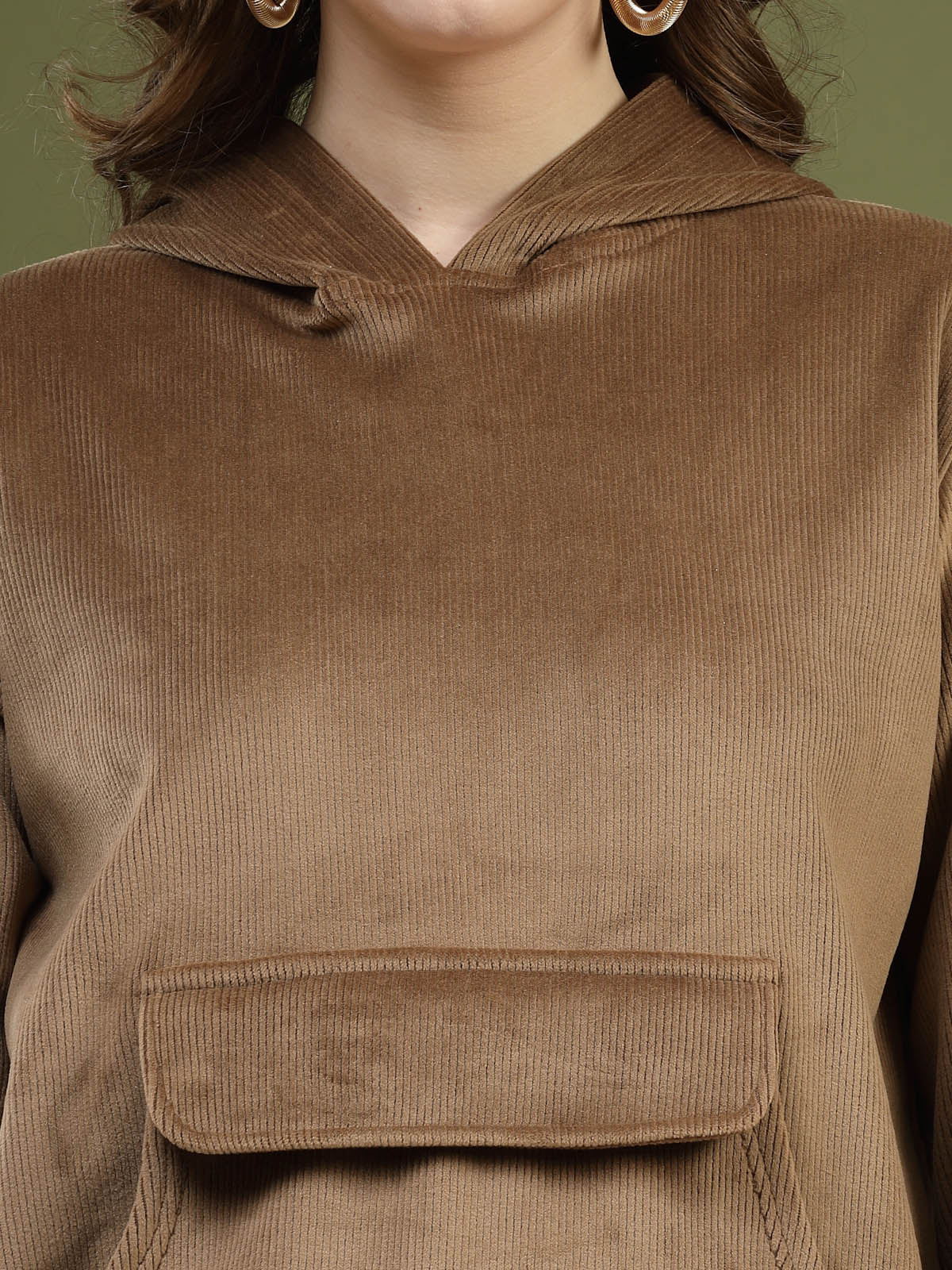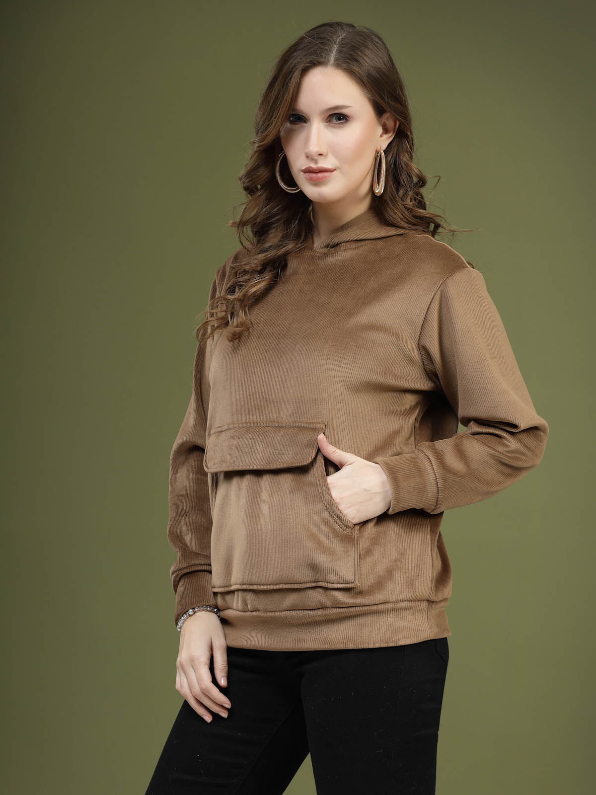 Brown Solid Hooded Long Sleeves Pullover Sweatshirt