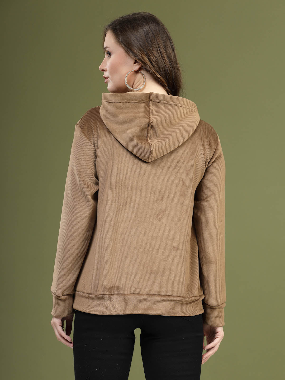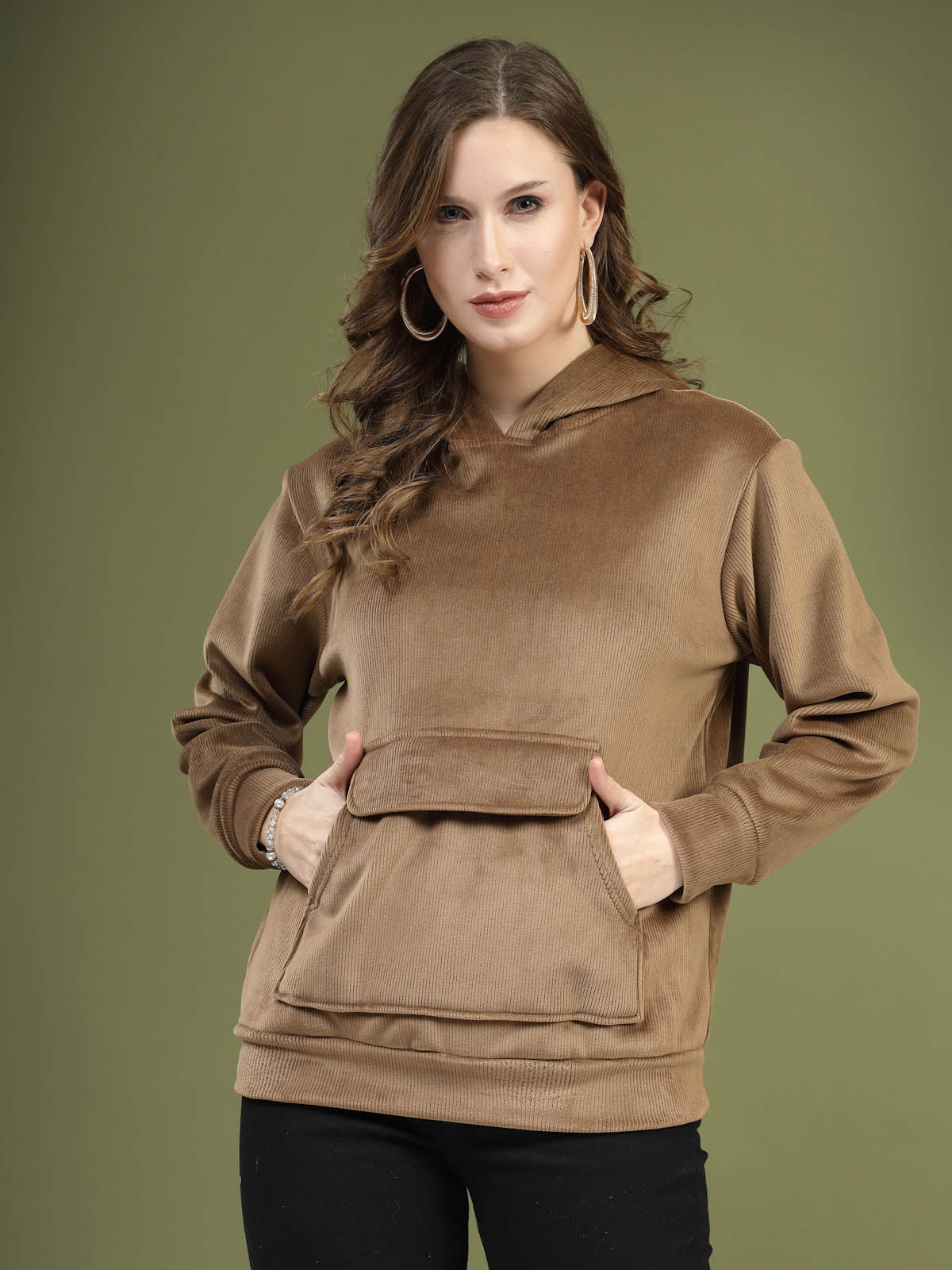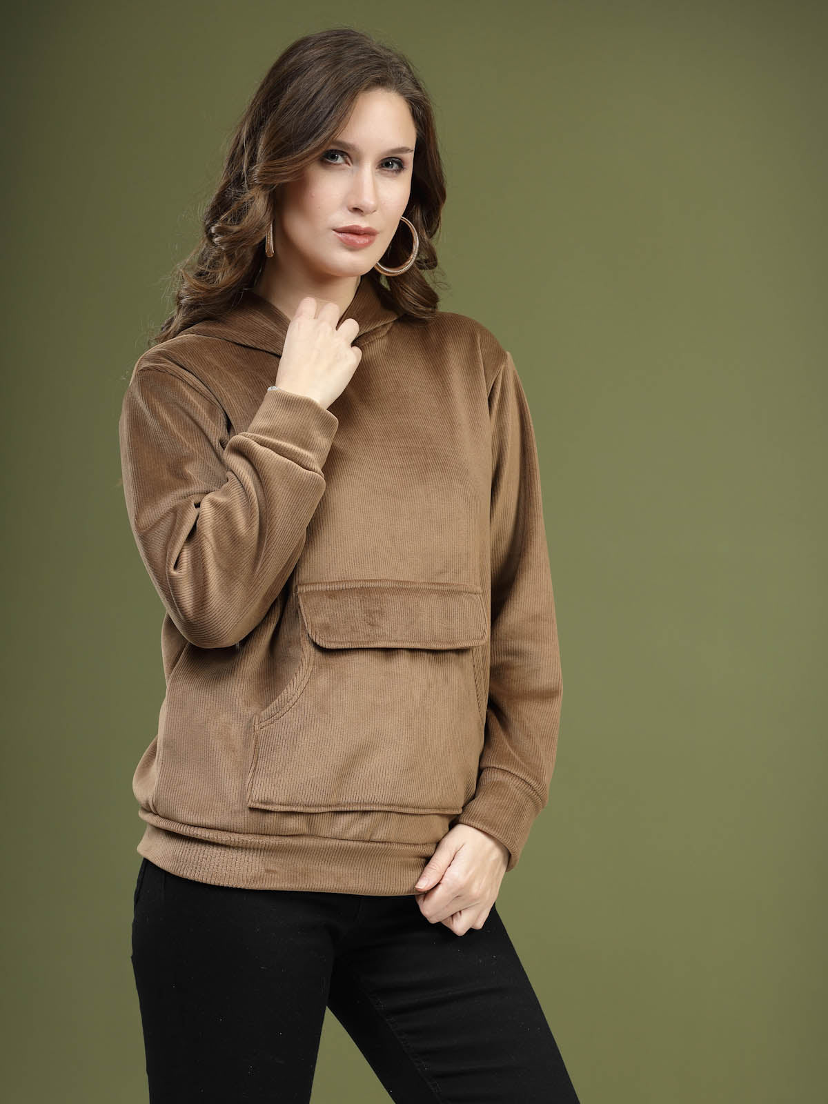 Brown Solid Hooded Long Sleeves Pullover Sweatshirt