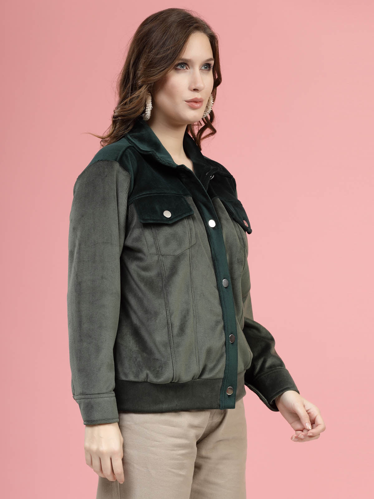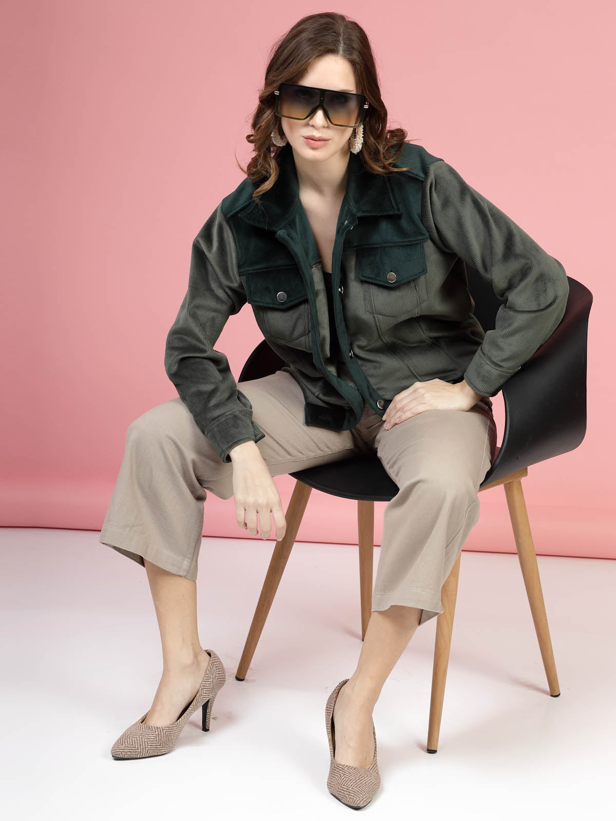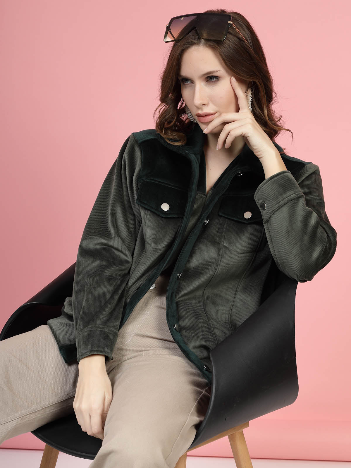 Solid Olive Self Design Spread Collar Bomber Jacket