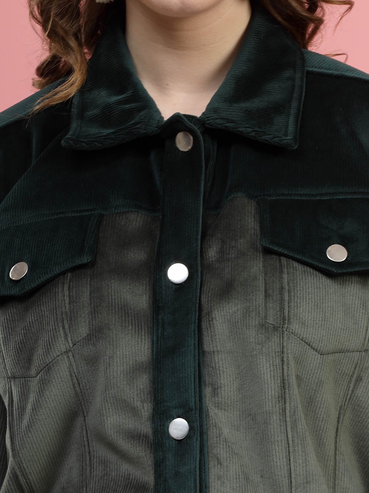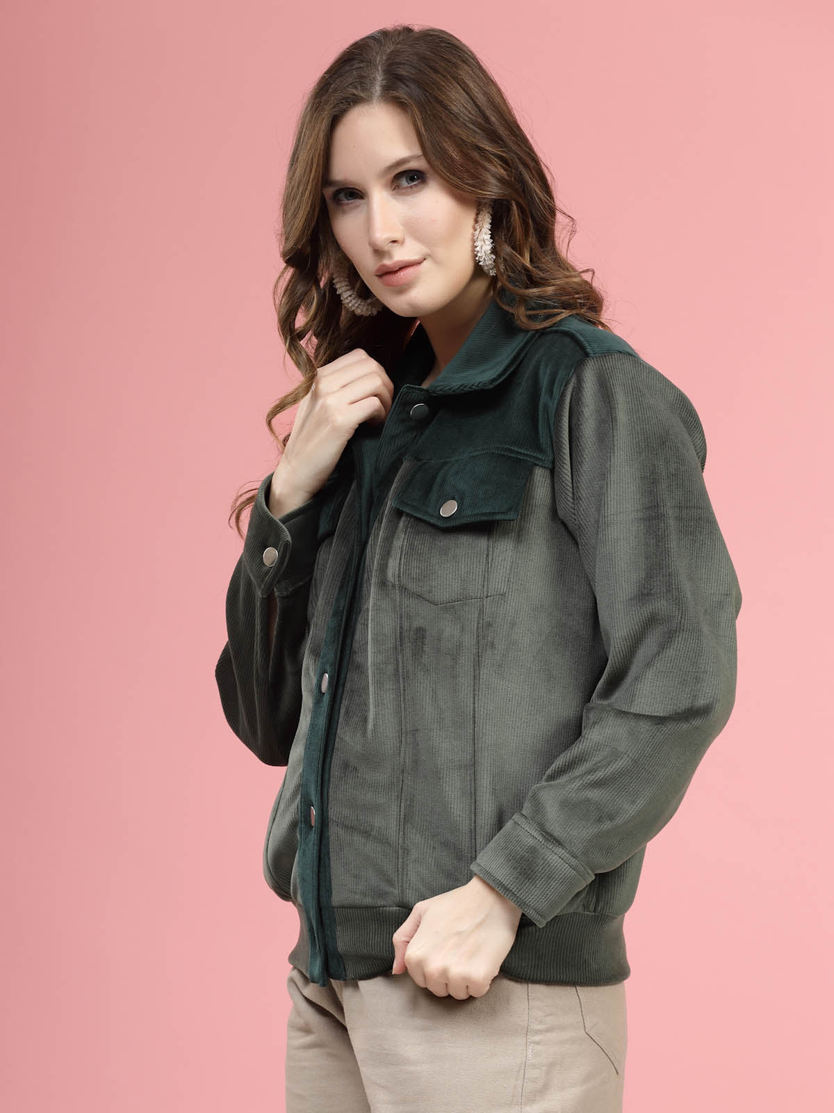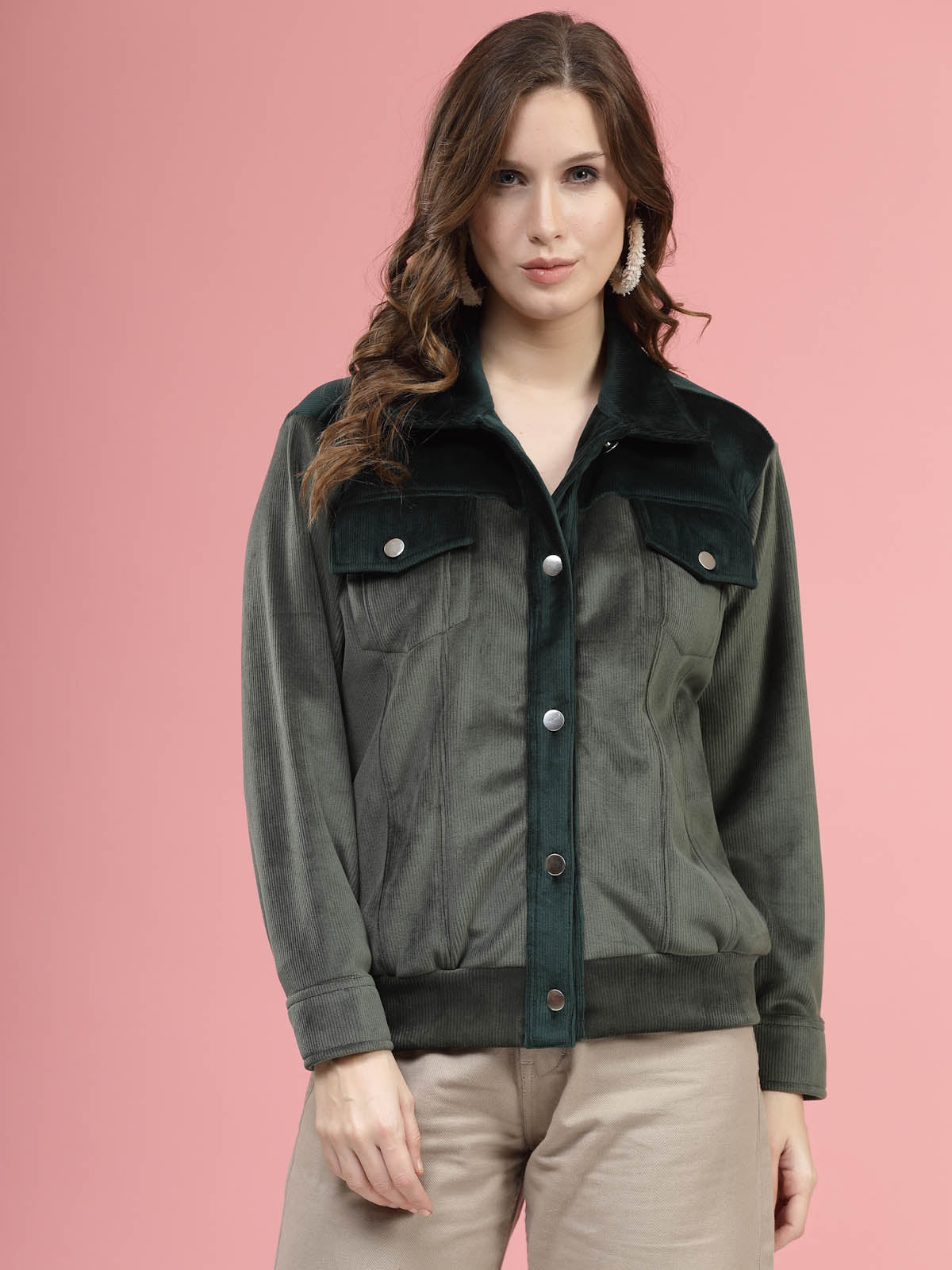 Solid Olive Self Design Spread Collar Bomber Jacket