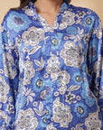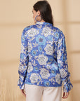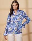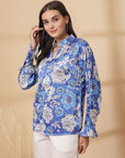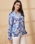 Blue Floral Print Mandarin Collar Bell Sleeve Shirt Style Top