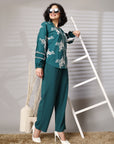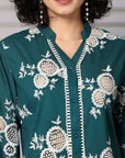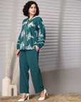 This co-ords consists of Shirt and Trousers Teal-Blue & White Embroidered Shirt, has Shirt Collar With Long Sleeves and button closure Teal-Blue Solid mid-rise Trousers, has Slip-On closure, has two pockets and flared hem. Expertly crafted for style and comfort, this co-ords set features an Embroidered Pure Cotton Shirt and Trousers in a timeless Teal-Blue & White combination. The Shirt boasts a classic Shirt Collar and Long Sleeves, while the Trousers offer Slip-On closure, two functional pockets, and a flattering flared hem. Perfect for any occasion, this set is designed to elevate your wardrobe with its luxurious details and high-quality materials.
