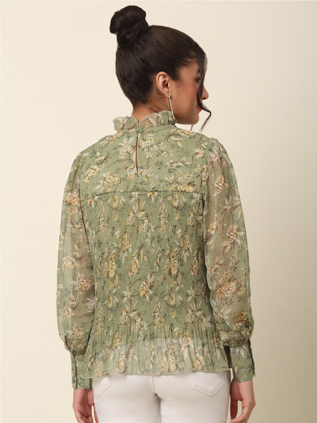 Olive Green Floral Printed High Neck Cuffed Sleeves A-Line Top