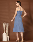 This dress offers a sleek and sophisticated look with its solid blue color and fit & flare design. The shoulder straps provide support and the sleeveless style allows for comfortable movement. The midi length and flared hem add a touch of elegance, while the concealed zip closure ensures a flawless fit.